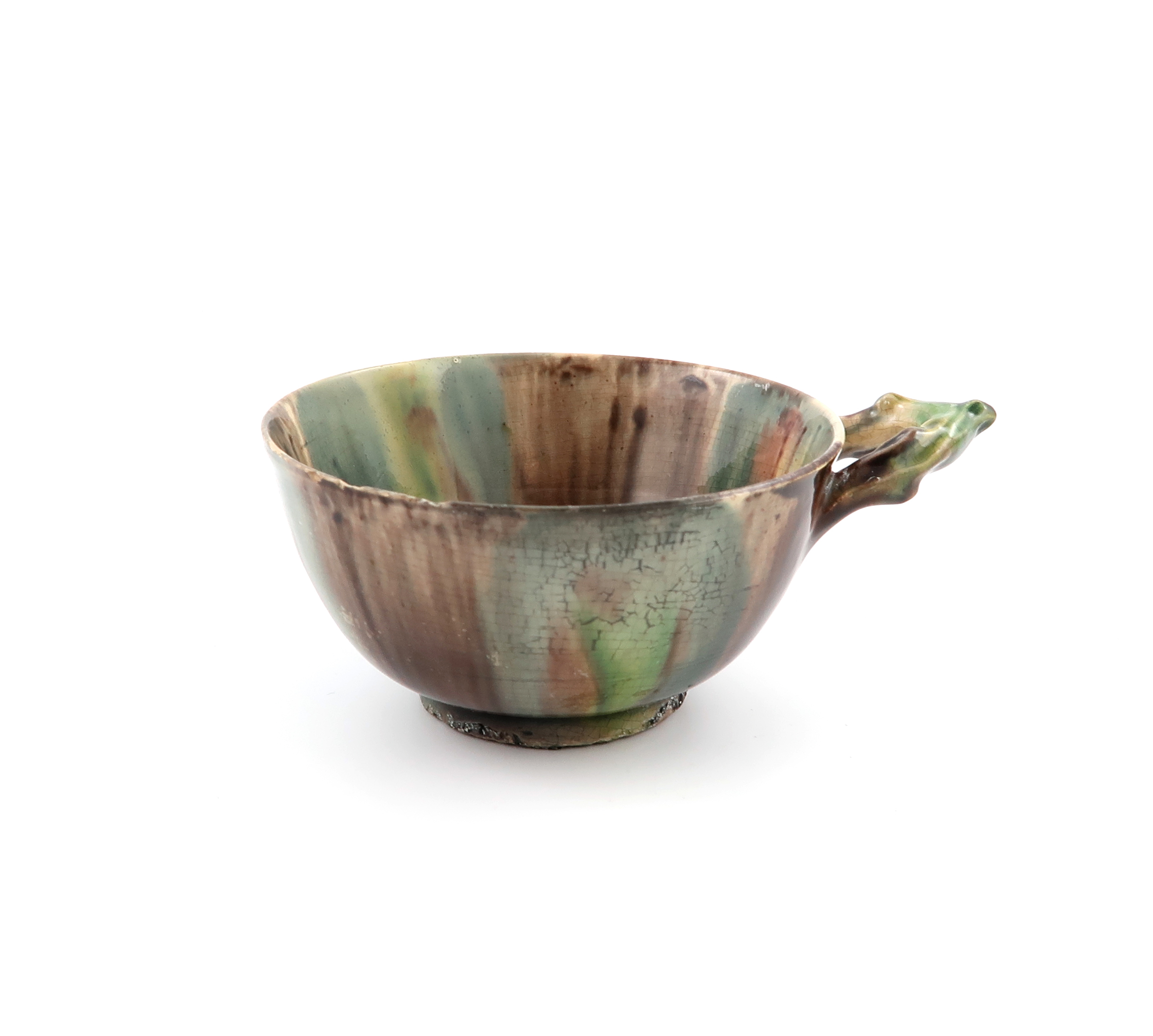 A rare creamware wine cup or taster of Whieldon-type, c.1760-70, the circular form with deep sides washed in running blue, green and manganese glazes, applied with a twig handle, and raised on a low circular foot, some good restoration, 10.2cm.