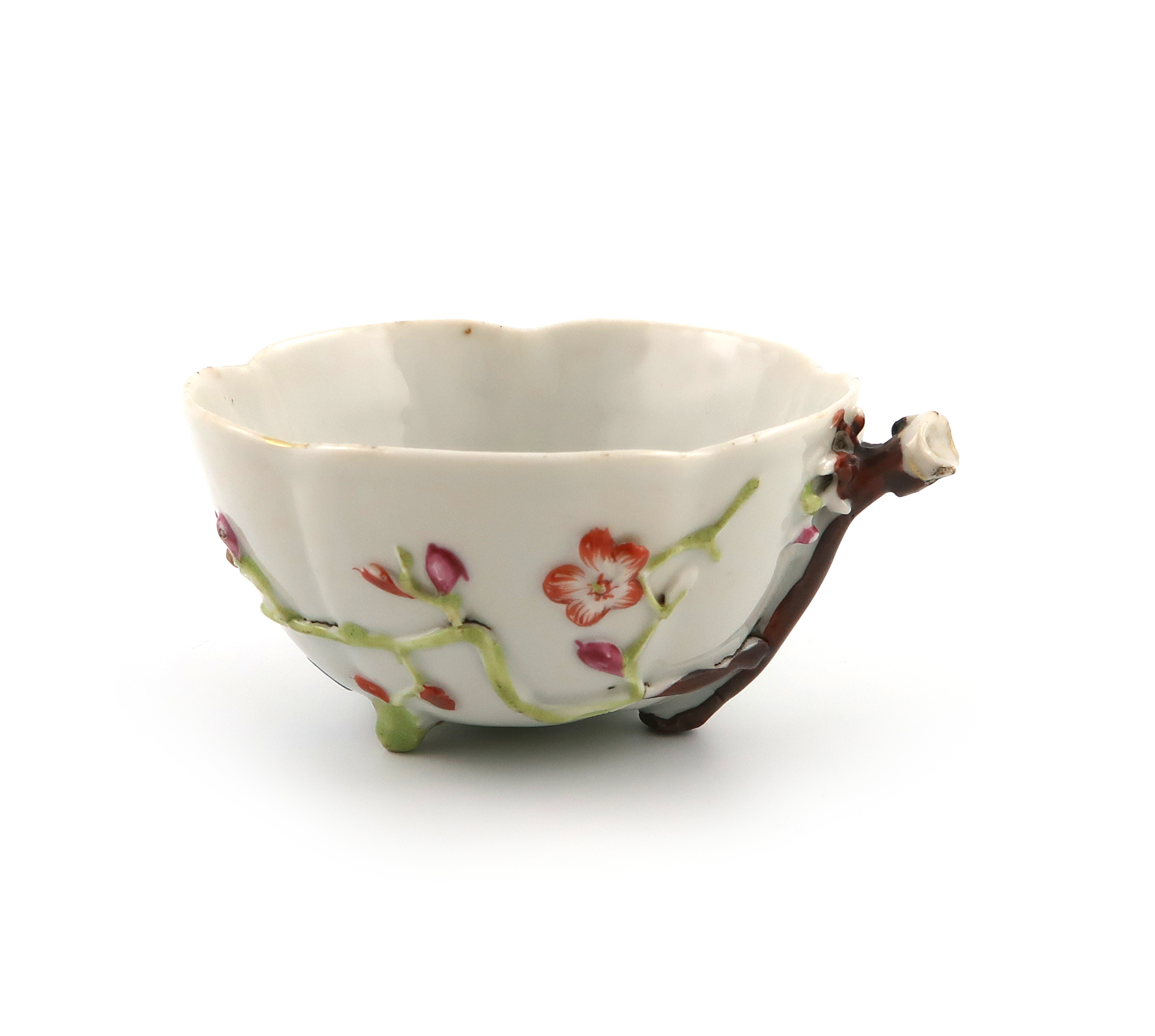 A Chinese porcelain wine cup or taster, late 18th/19th century, probably made for the European market, of deep cinquefoil form, applied to the exterior with an enamelled spray of flowering prunus extending to the short twig handle, minor faults, traces of gilding to the rim, 10.5cm.