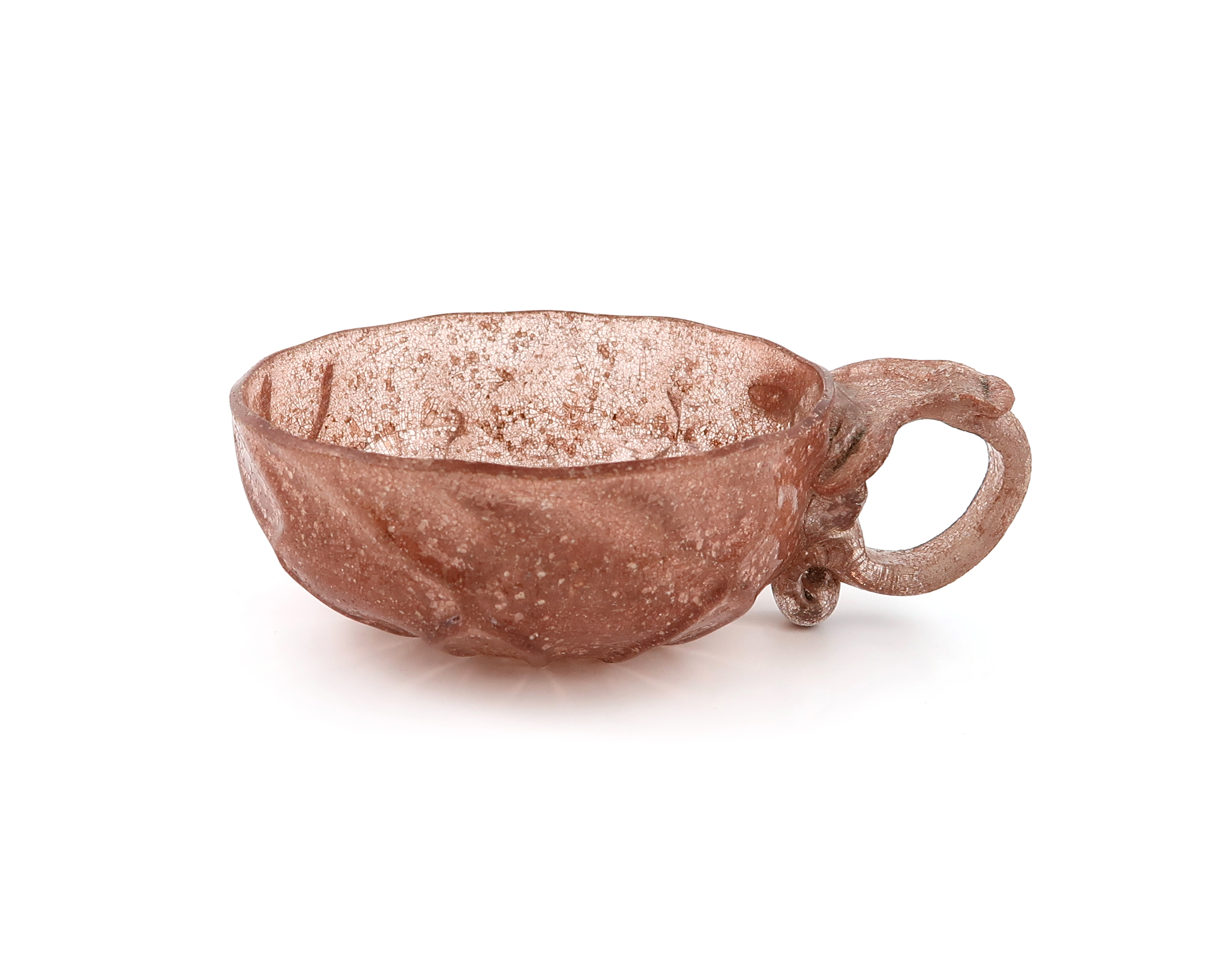 A façon de Venise tastevin or wine taster, 17th century, the glass of a pink hue, the circular body with 'nipt diamond waies', the wide loop handle with a scroll terminal, crizzled, 12cm across.