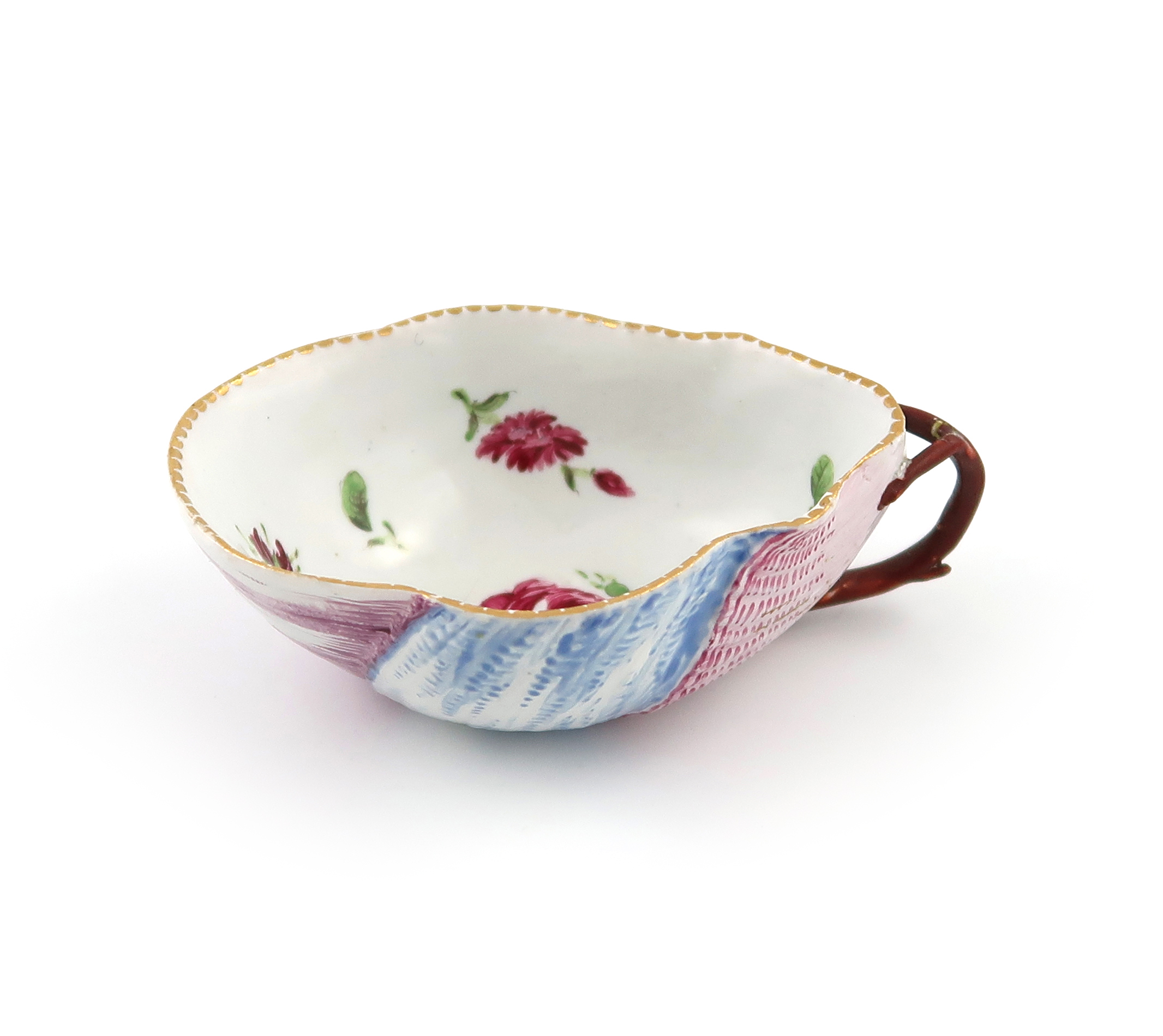 A rare Doccia wine taster, c.1765-75, of shell shape, enamelled to the exterior with different colours denoting different shells, the exterior with rose sprigs in puce and green, the handle formed as a twig, 10.5cm.