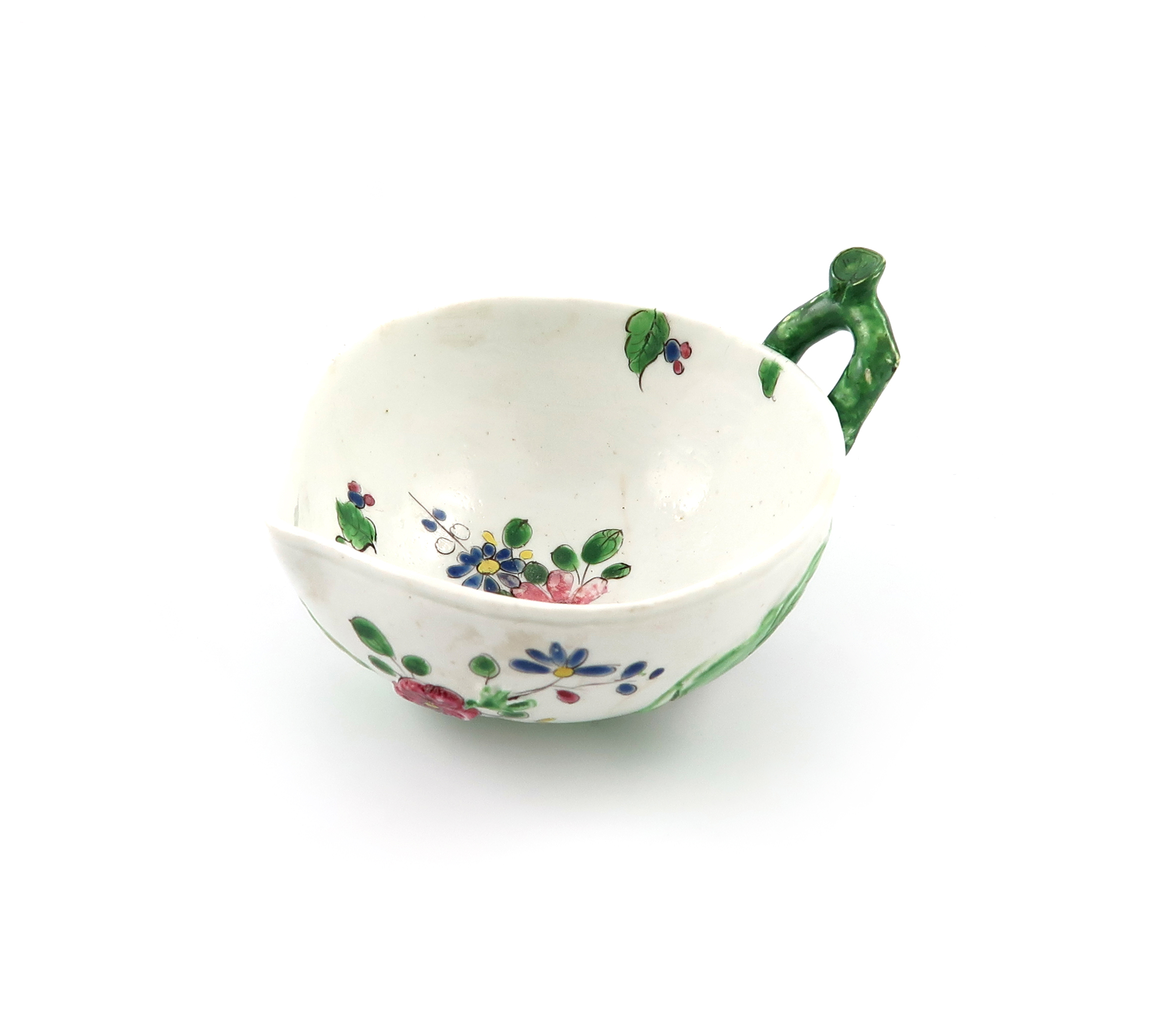 A Longton Hall cup or wine taster, c.1755, the peach-shaped body applied to the exterior with a flowering branch, its stem forming the twig handle, decorated in famille rose enamels with further flower sprays to the exterior and interior well, a filled rim chip, 13.8cm across.