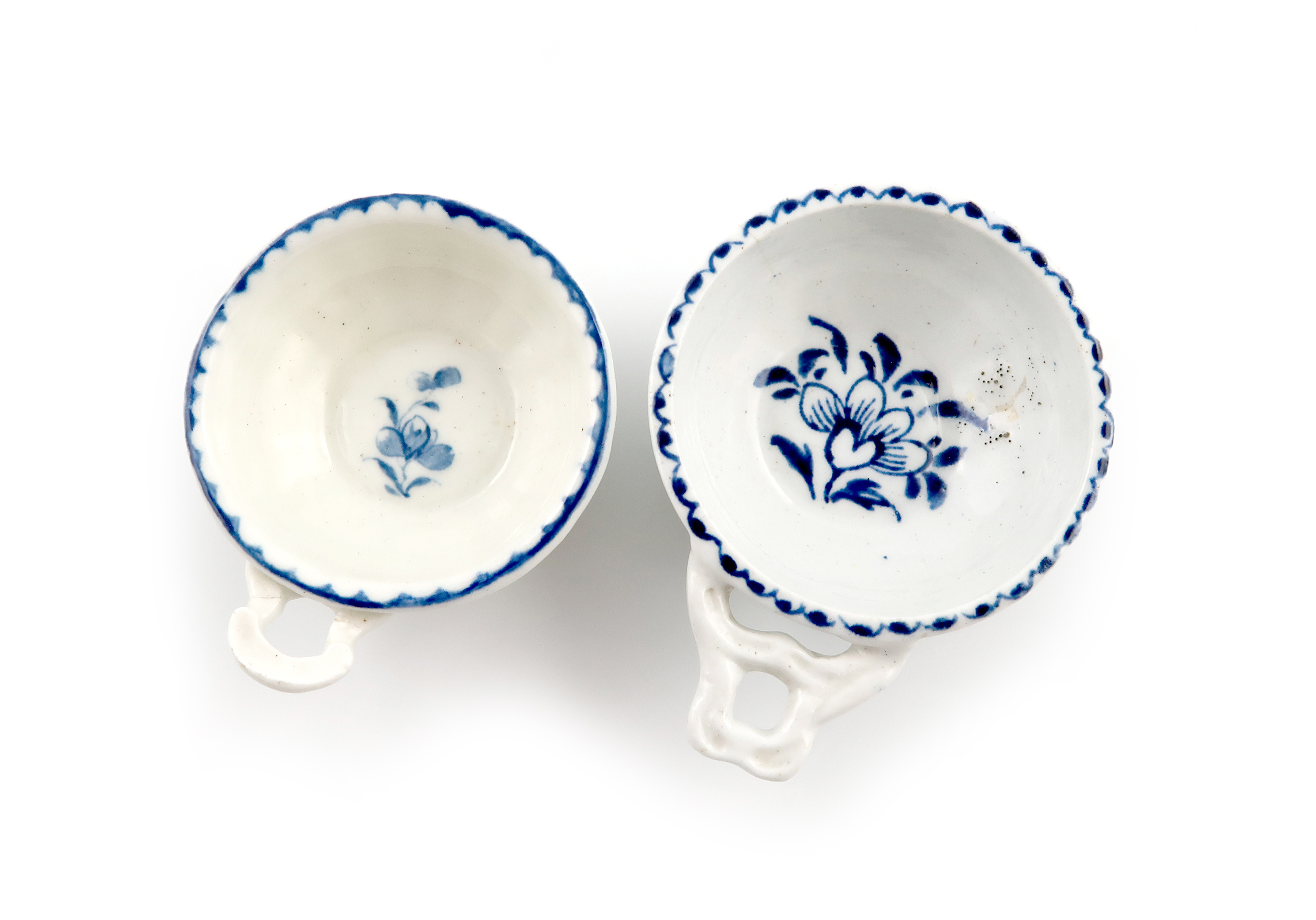 Two Derby blue and white wine tasters, c.1760-65, the shallow circular forms moulded with gadroons to the exterior, each painted to the interior with a small flower sprig within a narrow foliate border, applied with a pierced scroll handle, 8.1cm max. (2)