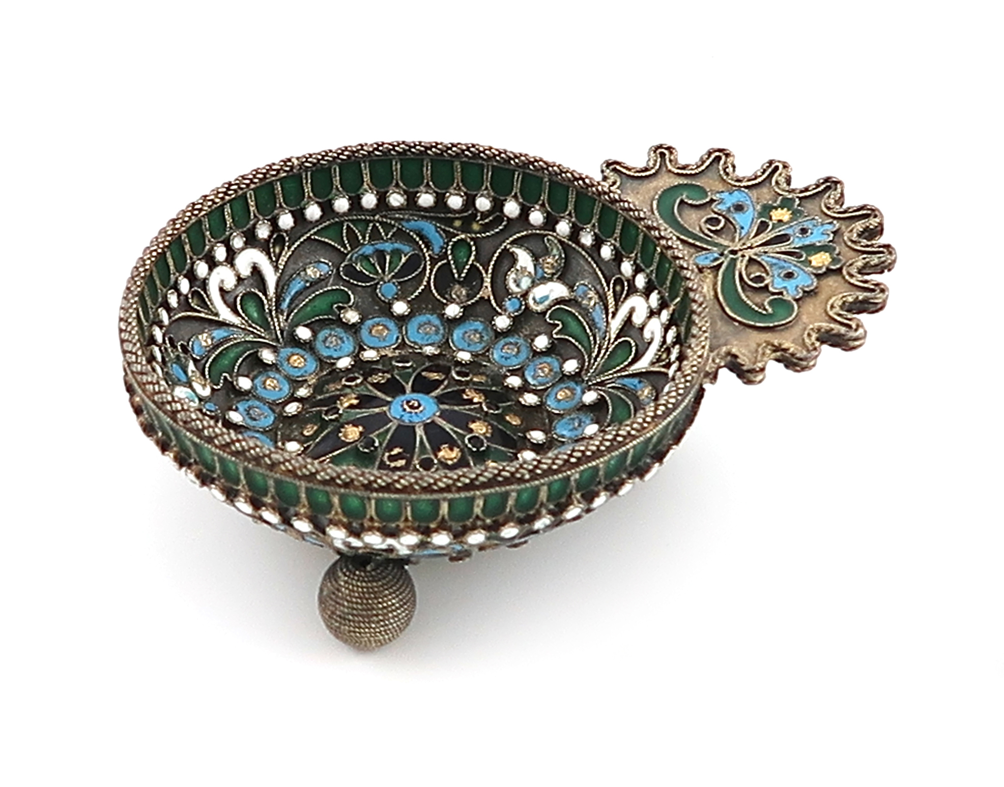 the circular bowl with vari-coloured enamel decoration, the handle with a wavy-edge border and enamel decoration, on three wire-work ball feet, length 8.5cm, approx. weight 2.4oz.