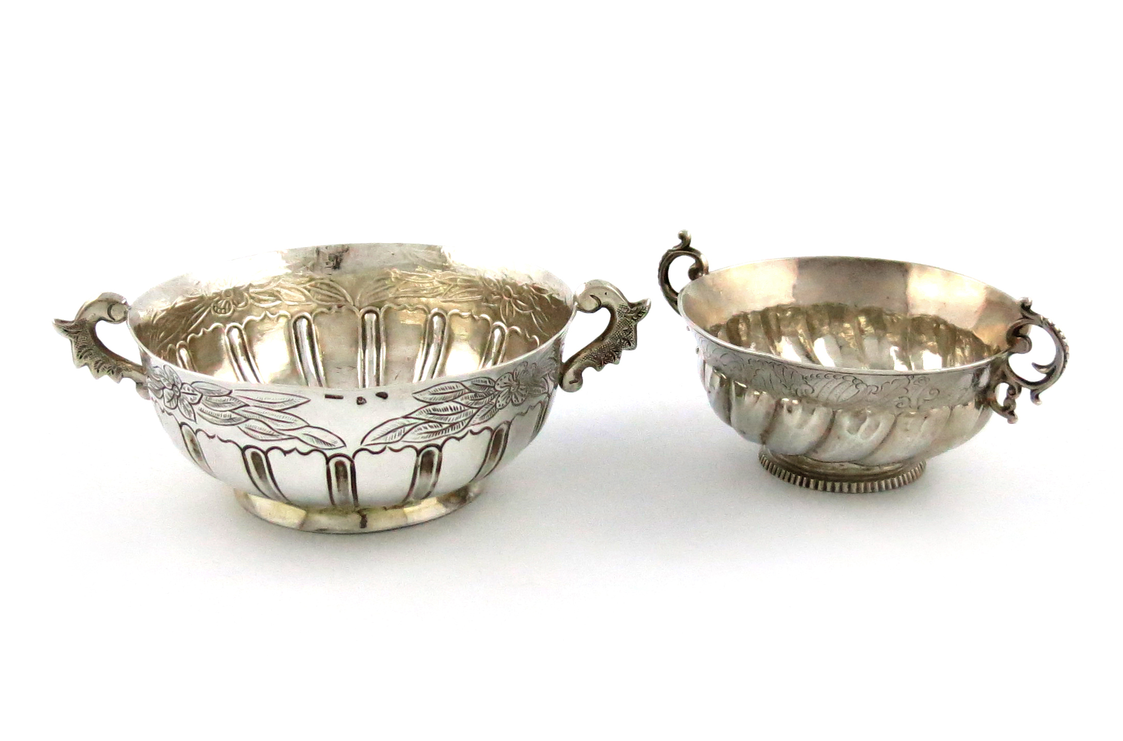 circular form, scroll handles, part-fluted decoration, the centre engraved with a bird, on a raised fluted circular foot, length handle to handle 11.7cm, plus a Mexican silver wine taster, bearing marks BTON, for Cayetano Buitron, length handle to handle 14.8cm, approx. weight 9.5oz. (2)