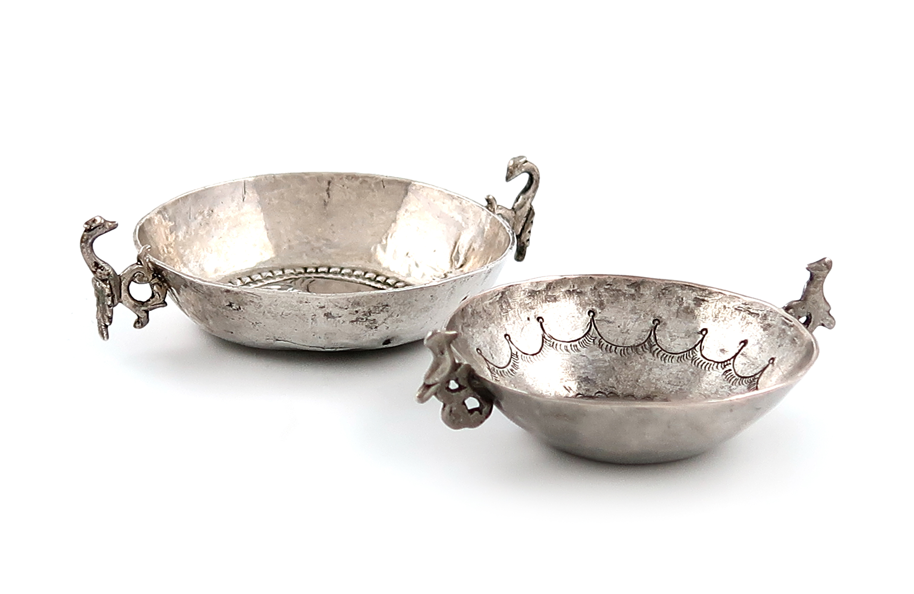 circular form, with stylised bird scroll handles, the centre embossed with a fish, length handle to handle 11.3cm, plus another South American silver wine taster, of circular form, bird scroll handles, engraved border, length handle to handle 9.8cm, approx. total weight 3.2oz. (2)