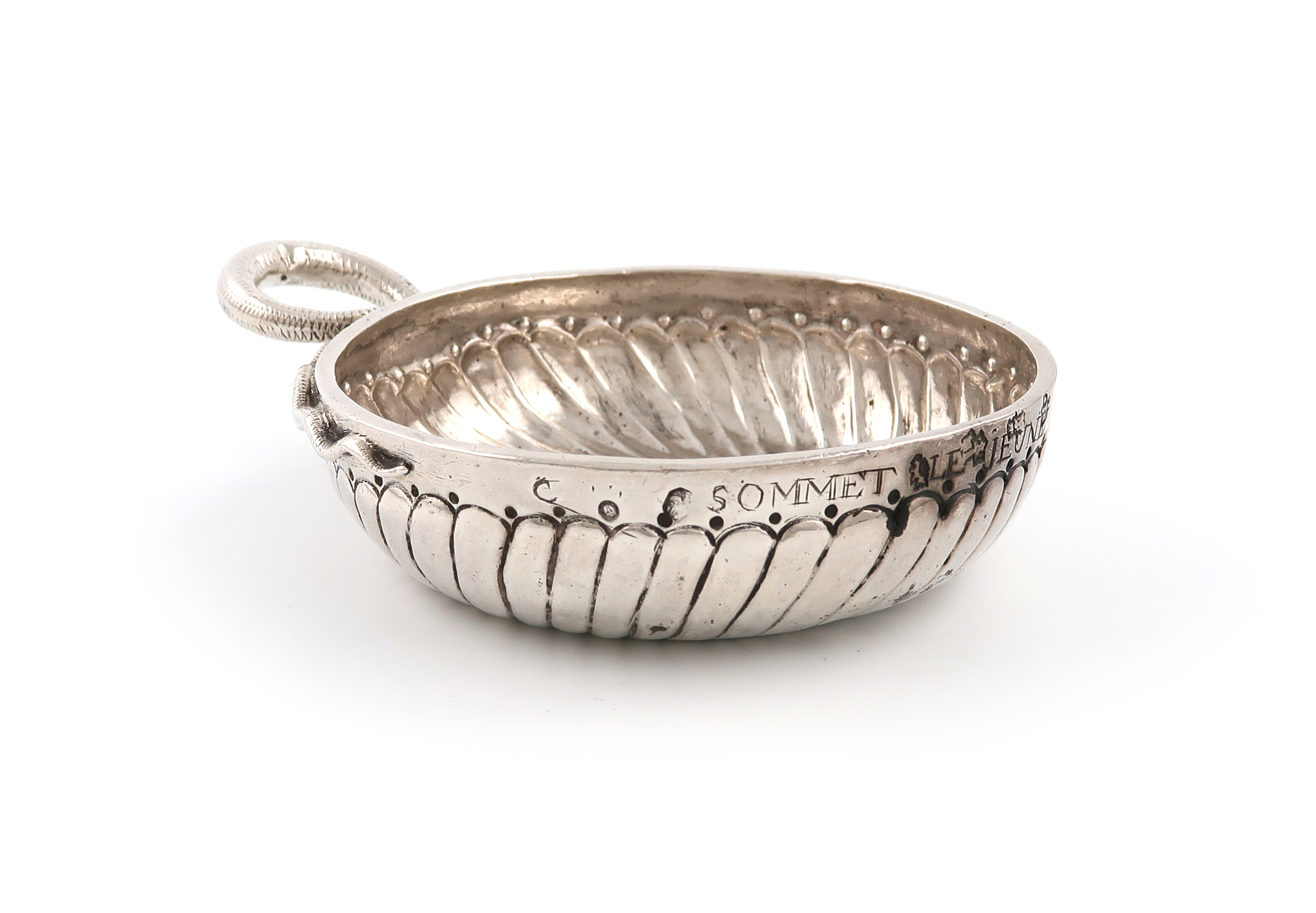 circular form, fluted decoration, snake ring handle, inscribed 'SOMMET LE JEUNE', length 11cm, approx. weight 3.1oz.