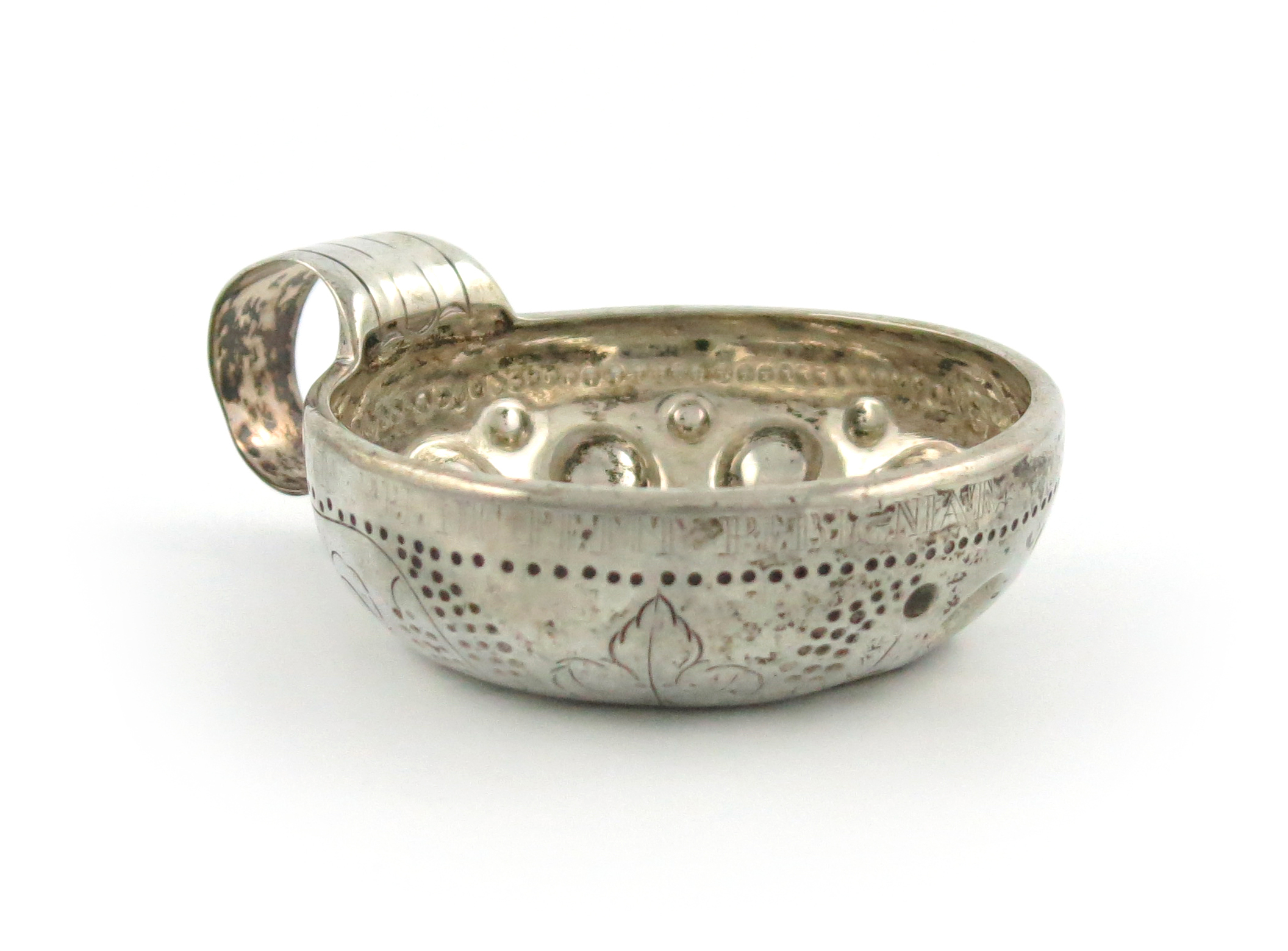 circular form, punch bead and grape decoration, fluted scroll handle, with a worn inscription, length 10.2cm, approx. weight 2.7oz.
