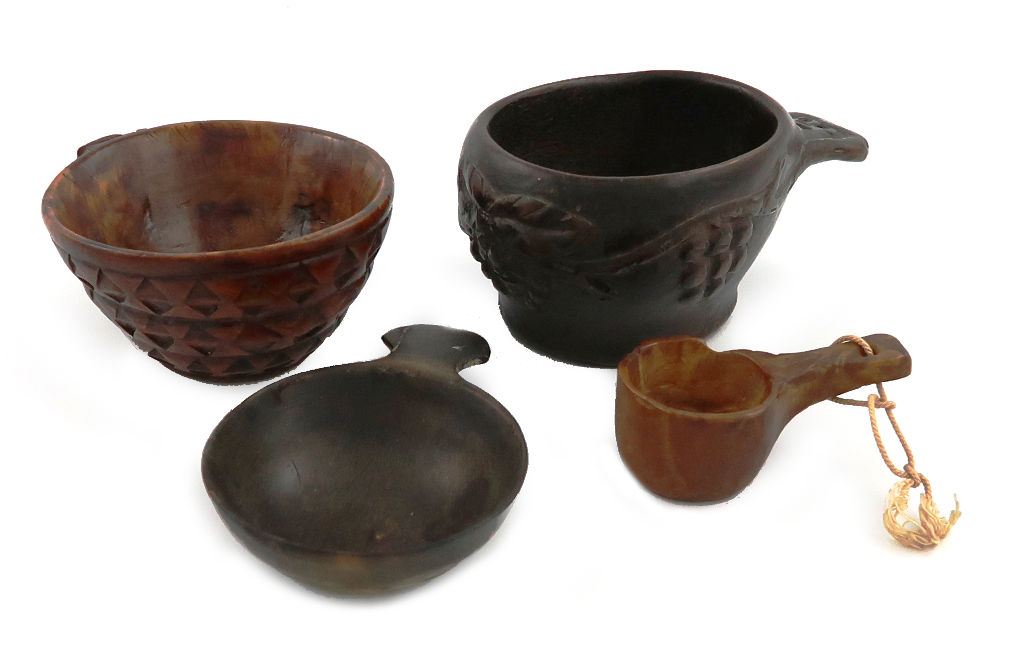 comprising: one of oval form, carved with grape decoration, pierced lug handle, length 11.5cm, plus one of tapering circular form, carved decoration, plus one other and a horn one, of plain circular form, plain handle. (4)