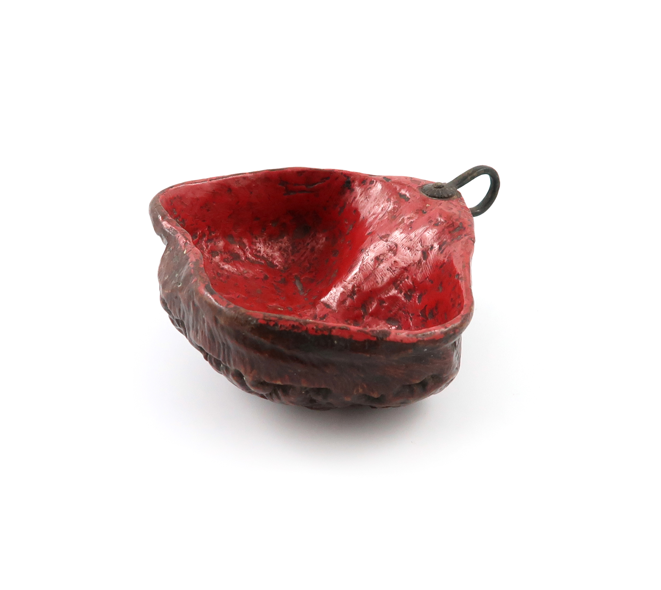 shaped form, the bowl with red lacquer decoration, with a brass ring handle, length 8cm.