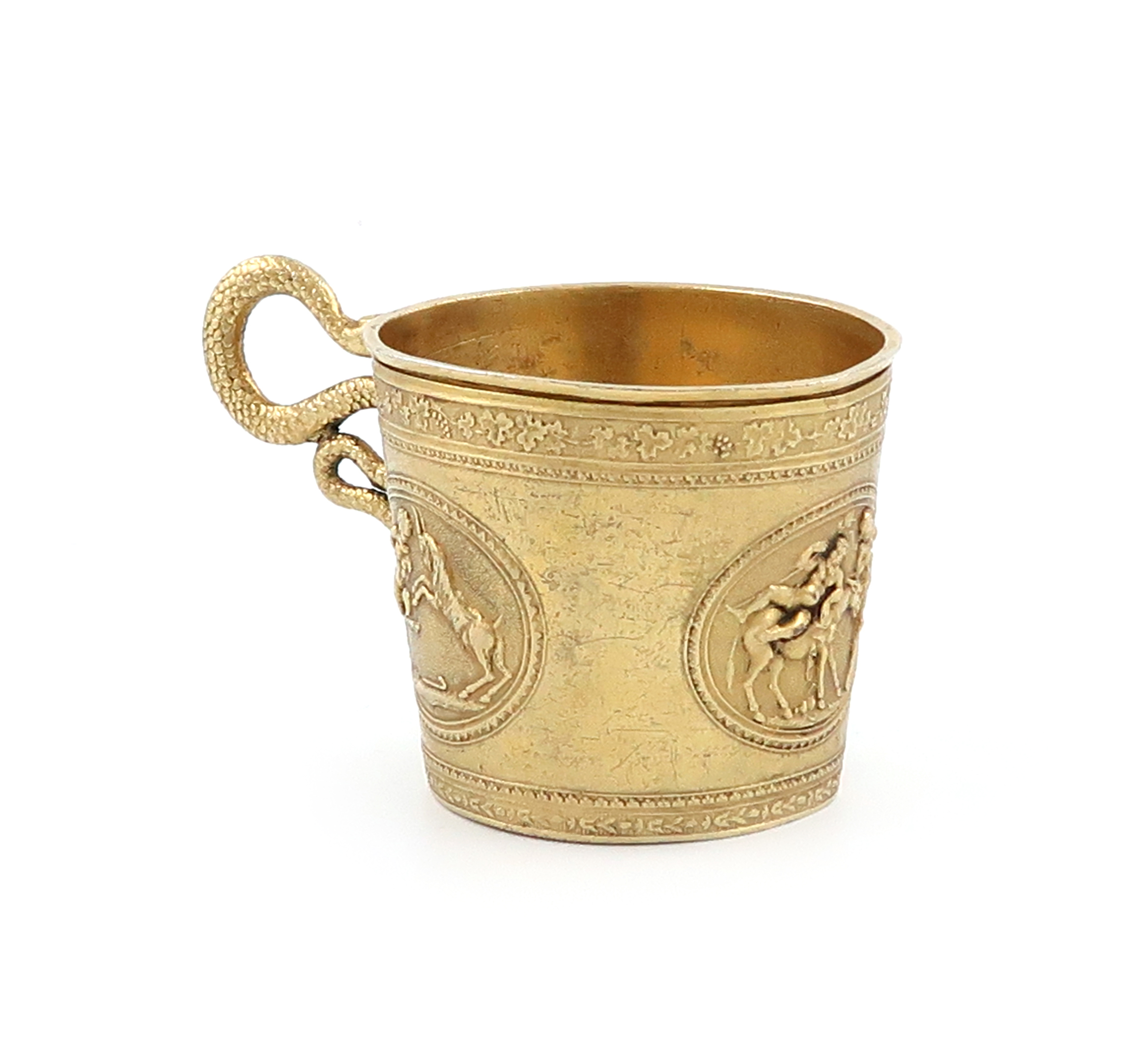 tapering circular form, with classical panels and foliate borders, snake scroll handle, height 4.2cm, approx. weight 1.3oz.