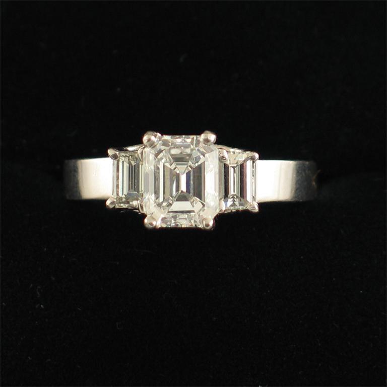 A diamond ring, the emerald cut diamond is set with two baguette shaped shoulder diamonds in platinum. With a gemmological certificate from the GIA No. 395379402 stating that the centre diamond weighs 1.51 carats, colour F with SI 1 clarity.