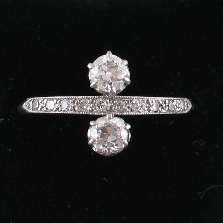 A diamond two stone ring, set with two circular cut diamonds with a central line of smaller diamonds millegrain set in platinum and gold.
