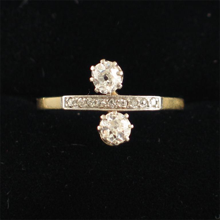 A diamond two stone ring, set with a line of nine small diamonds between two larger circular cut diamonds in gold.