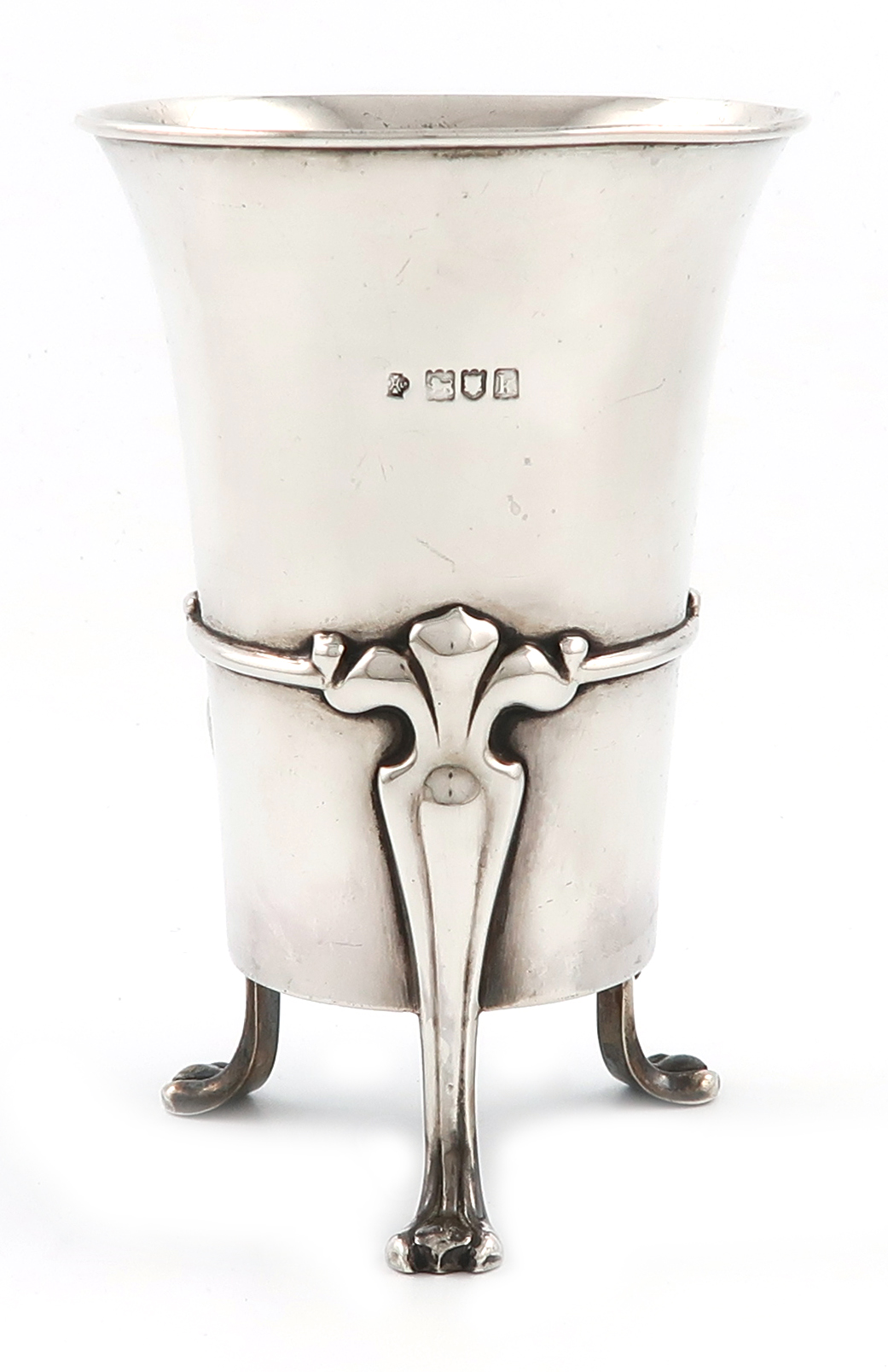 tapering circular form, central girdle, on three stylised Art Nouveau legs with paw feet, height 14.7cm, approx. weight 7.5oz.