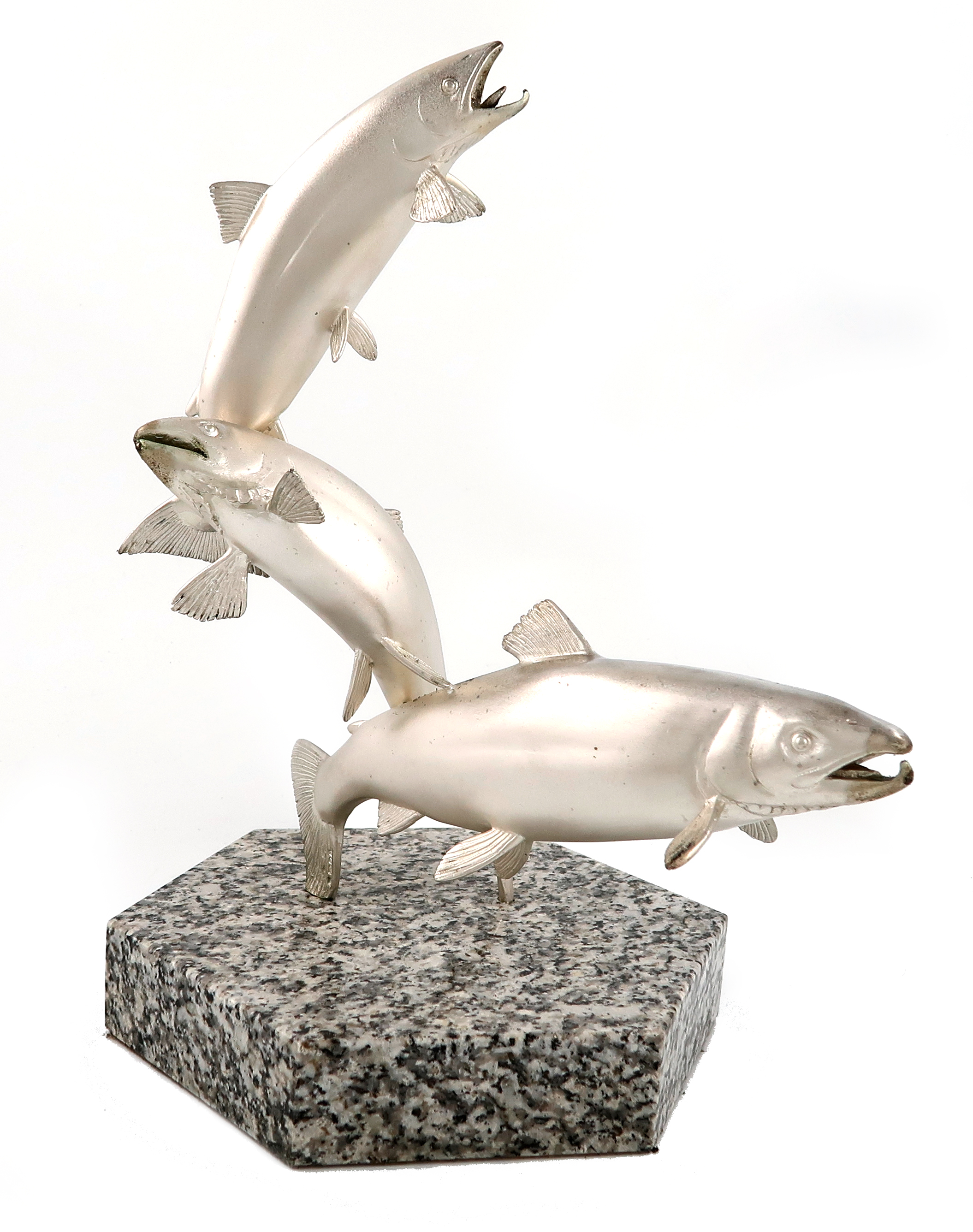 modelled as three conjoined salmon, on a hexagonal hardstone base, with a loose plaque inscribed ' The Leaping Salmon, David Wynne', in a wooden carrying case, with the original certificate height on plinth 31cm.
