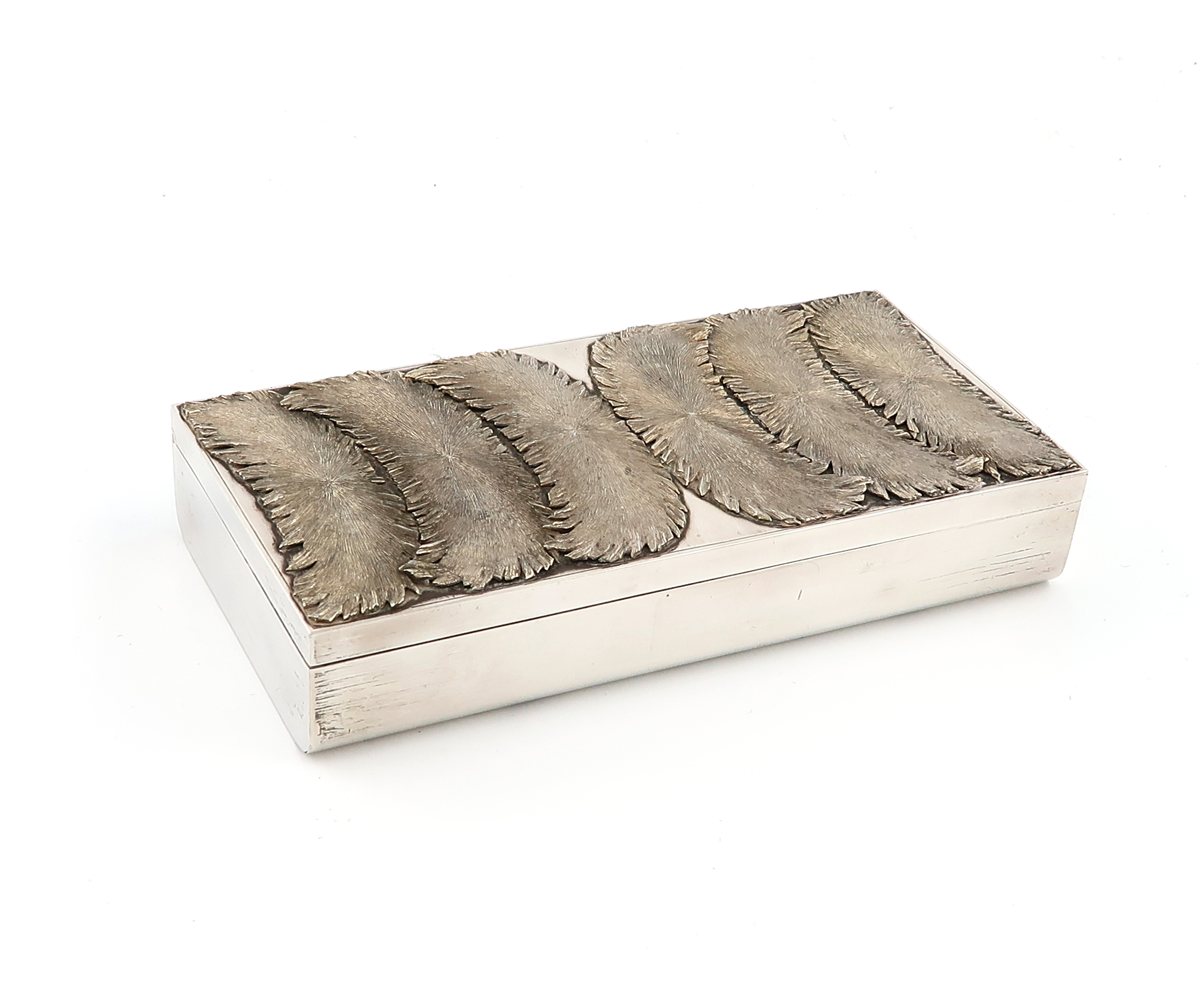 rectangular form, the hinged cover applied with six textured and gilded feather designs, the interior black leather lined and the interior cover gilded, length 17.8cm, approx. total weight 21oz.
