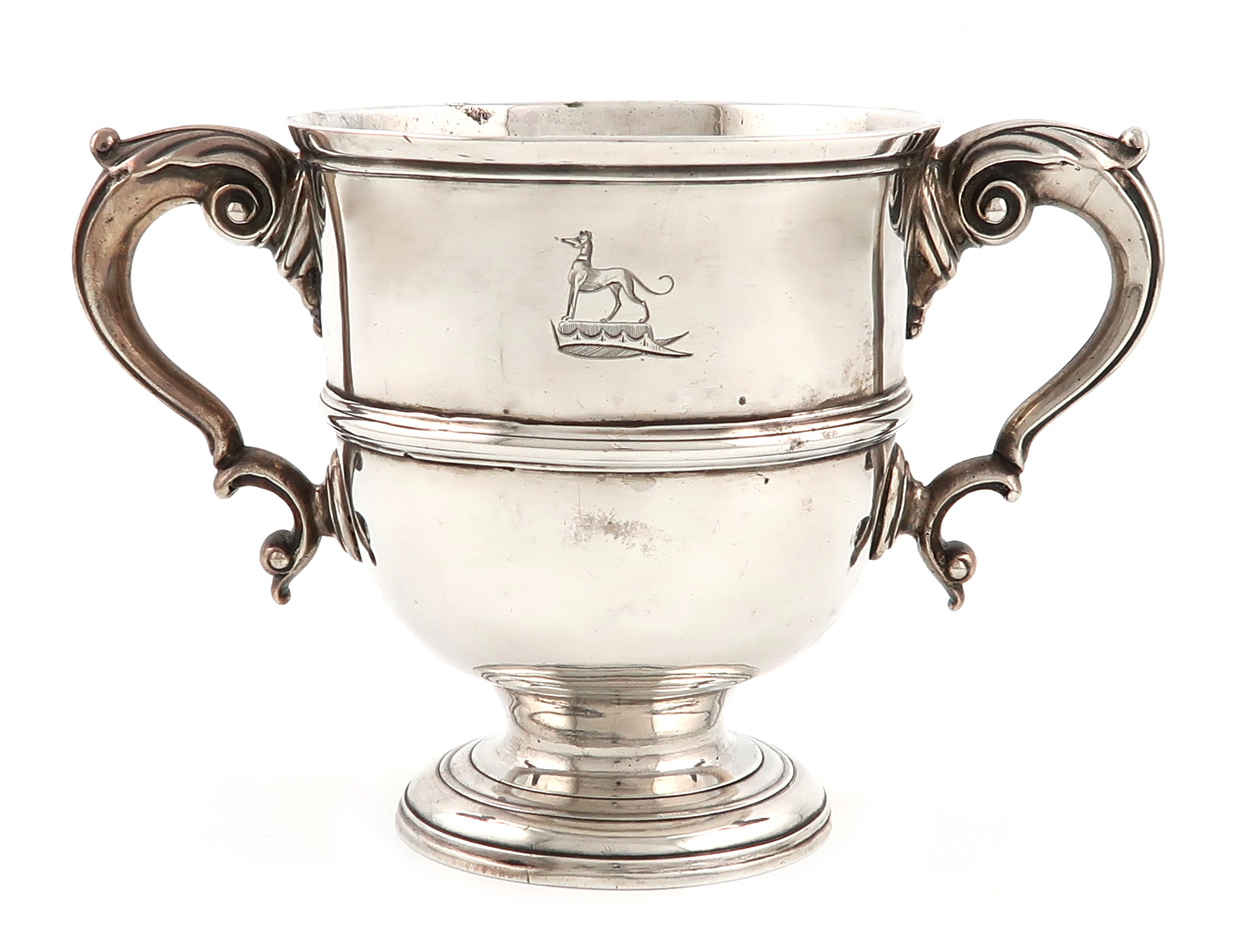 circular form, central girdle, leaf capped scroll handles, engraved with a later crest, on a circular foot, height 11.4cm, approx. weight 13oz.
