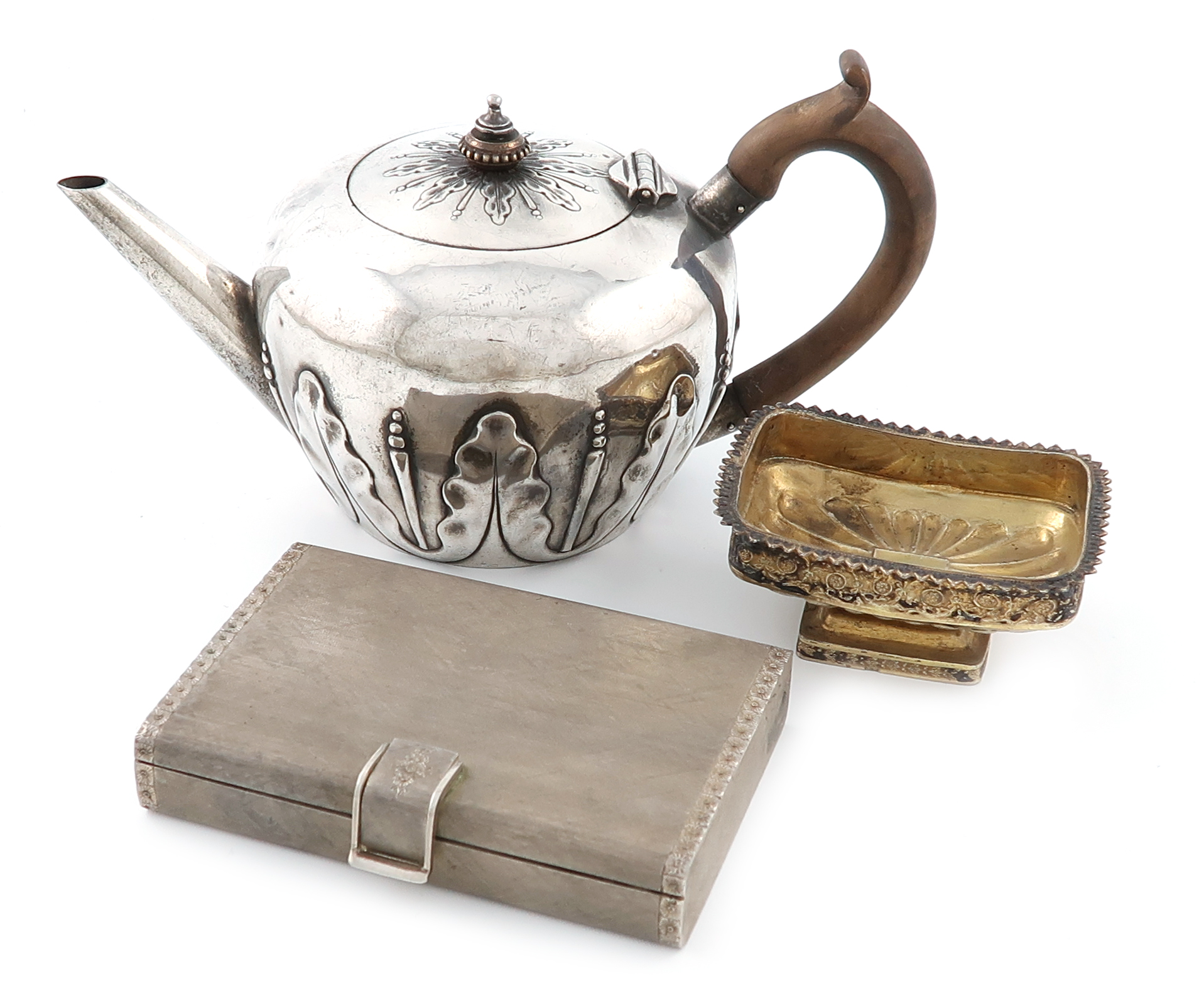 circular form, acanthus leaf decoration, straight spout and scroll handle, initialled, plus a 19th century Russian silver-gilt salt cellar, maker's mark CP, Moscow, rectangular fluted form, foliate border, length 8.8cm, and a continental metalware compact, with a lipstick and two compartments, approx. weighable 12.4oz. (3)