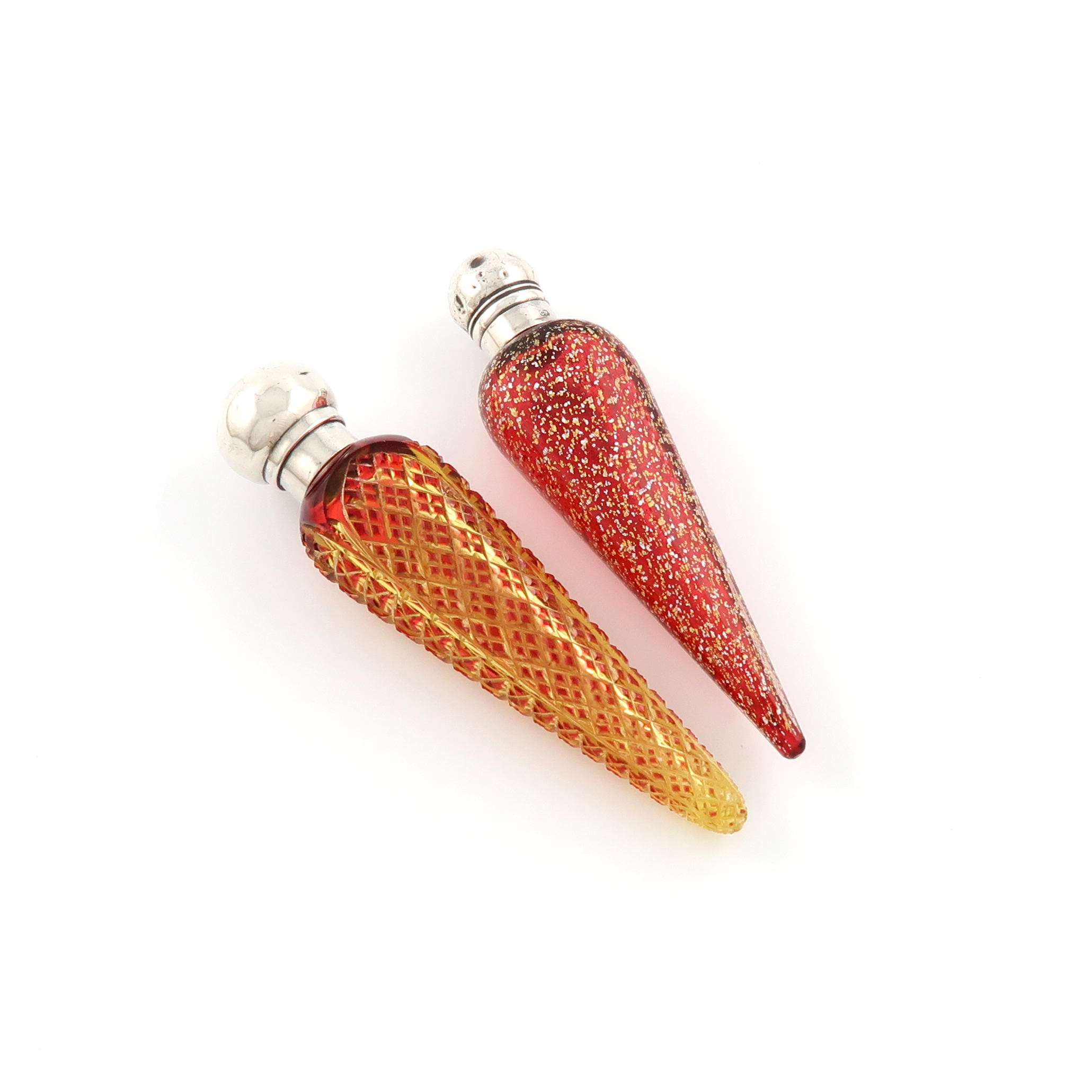 icicle form, speckled gold and silver coloured decoration, screw-off cover, length 12.3cm, plus another Victorian silver-mounted scent bottle of similar form, by D and L Spiers, with red and yellow cut-glass body, length 13cm. (2)