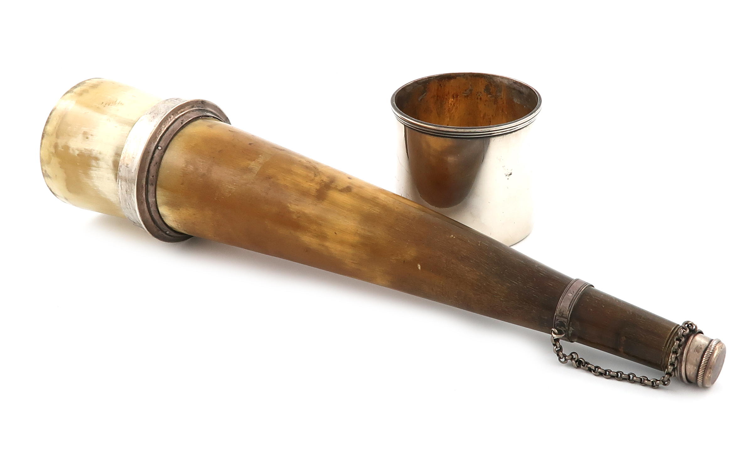 An early-Victorian silver-mounted horn spirit flask and drinking cup