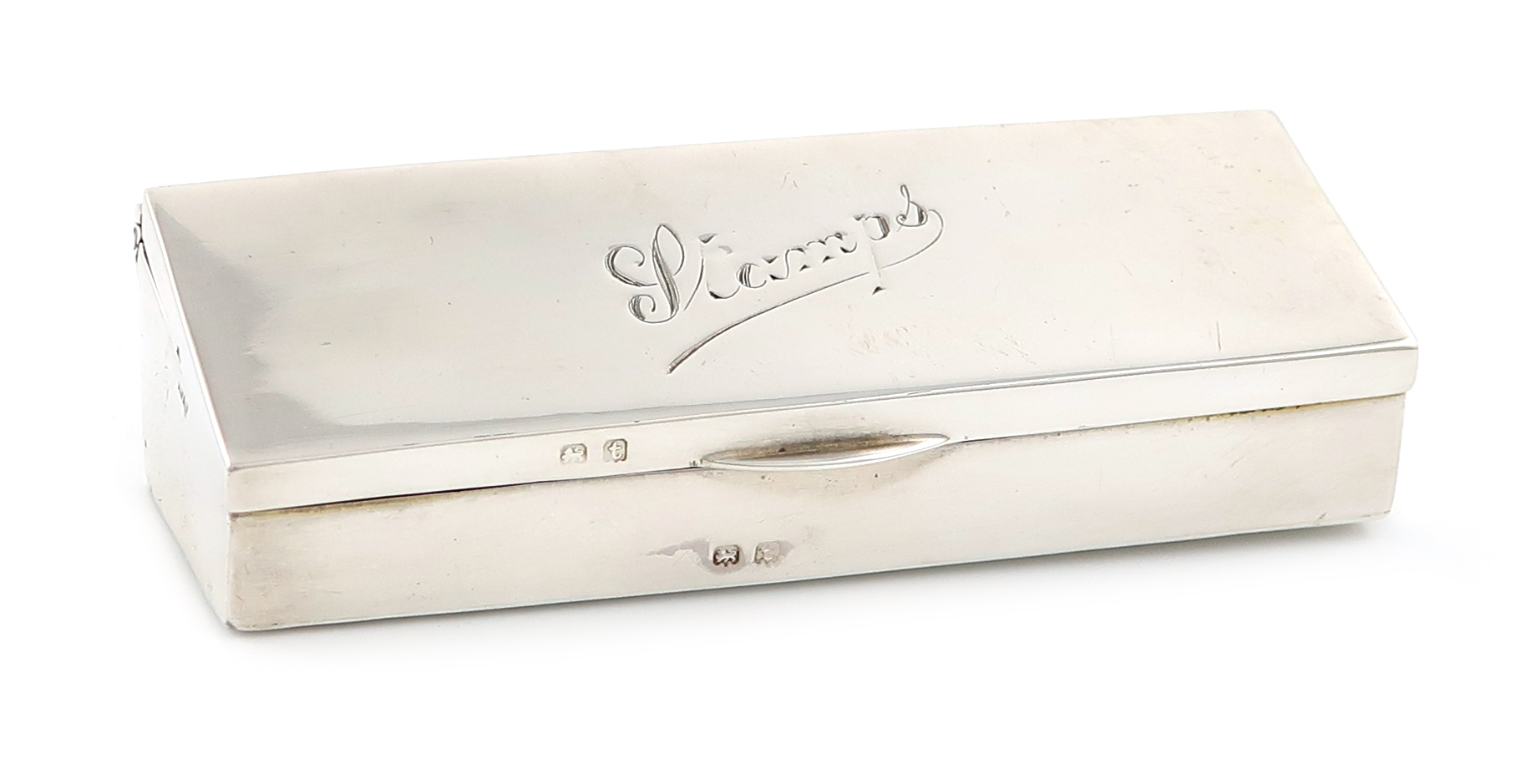 rectangular form, slanted hinged cover, inscribed 'Stamps', the interior with three gilded sections, length 8.5cm, approx. weight 1.9oz.