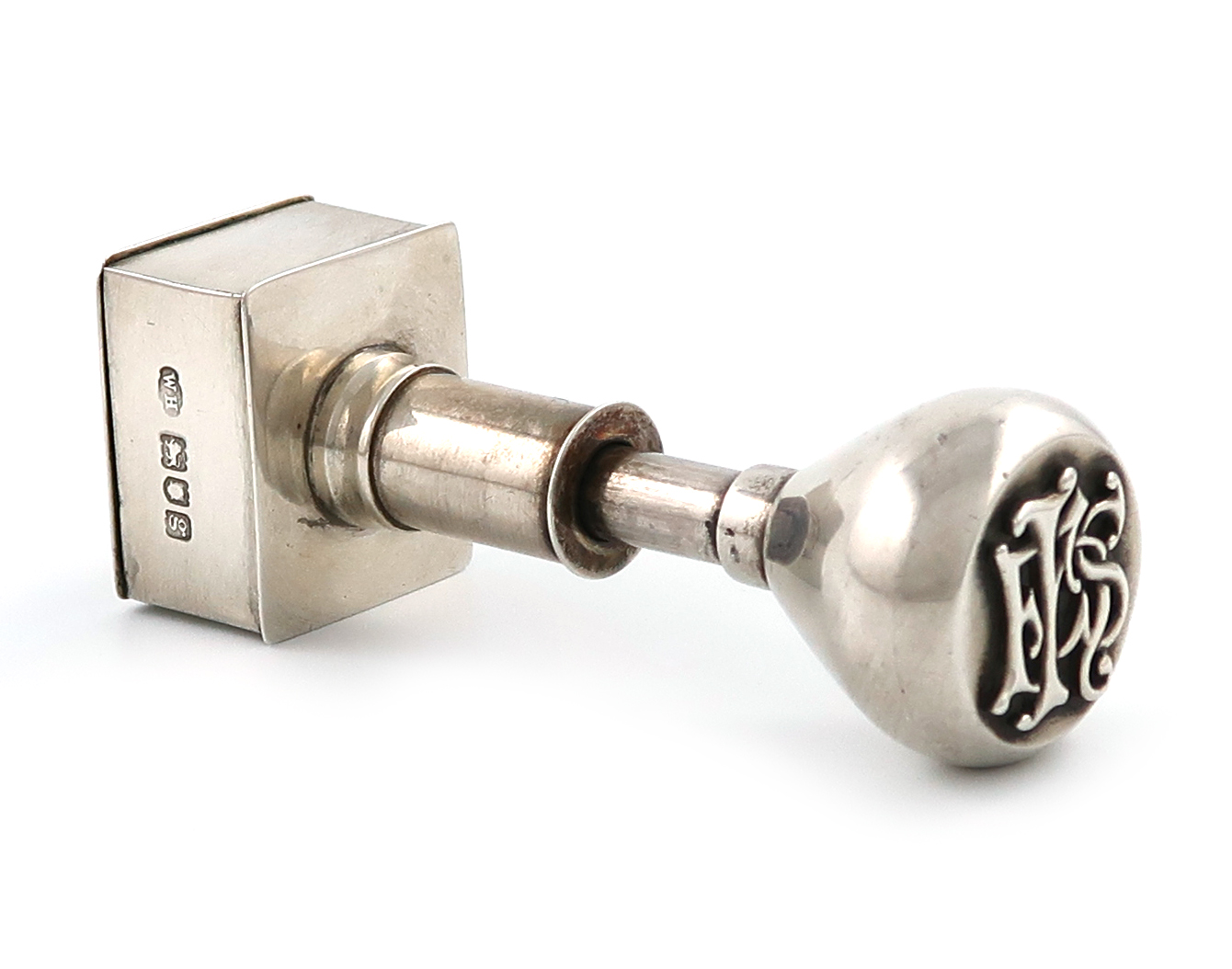 rectangular form, with a push-down baluster handle applied with a monogram, height 8cm, approx. weight 1.3oz.