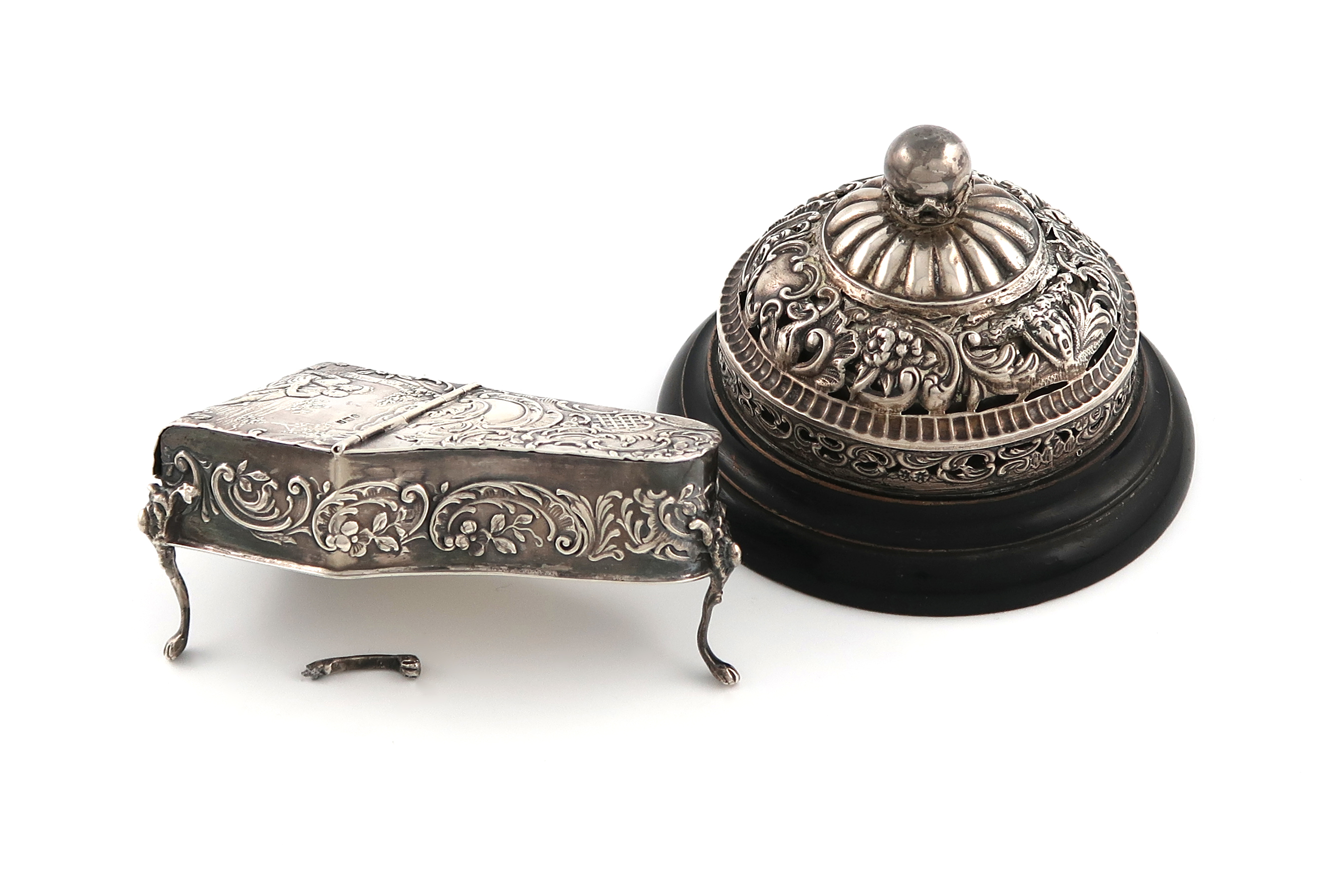 modelled as a piano, probably for stamps or vestas, embossed with figures and foliate decoration, two hinged covers, one leg damaged, length 9.3cm, plus an Edwardian silver table bell, maker's mark worn, London 1902, circular form, pierced and embossed with masks, and foliate scroll decoration, on a circular base, approx. weighable 3.8oz. (2)
