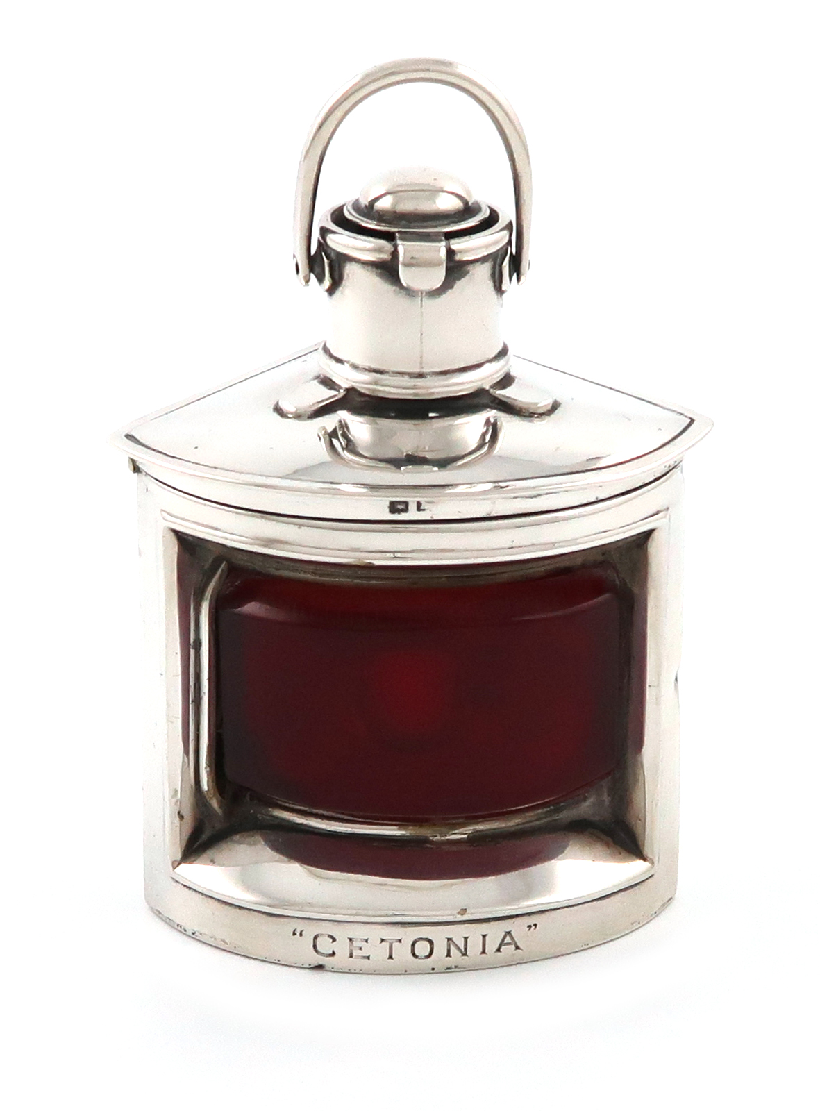 the light with a hinged cover and hinged loop, gilded interior, the front inscribed 'CETONIA', height 9.5cm, approx. weight 3.3oz.