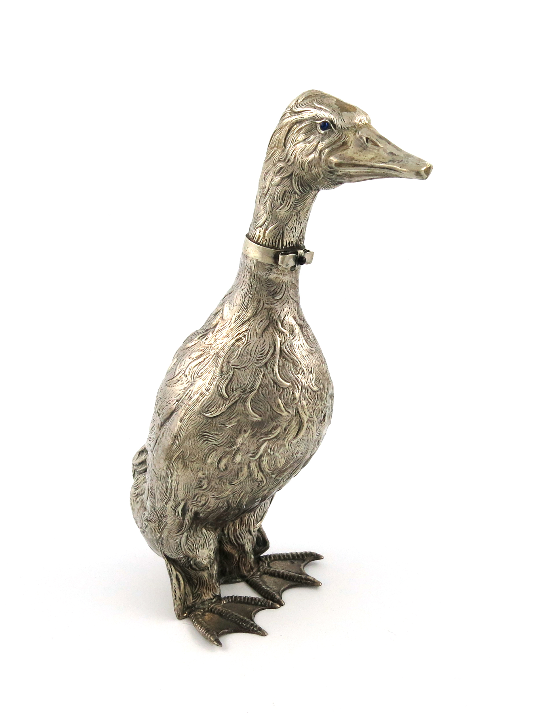 modelled in a standing position, the pull-off head set with blue eyes and with a bow tie, textured feathers, height 22.2cm, approx. weight 5.9oz.
