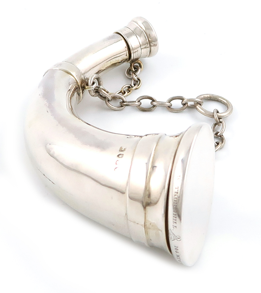 horn form, screw-off mouth-piece cover, the main hinged cover opens to reveal a silver-gilt pierced and engraved foliate grille, with a chain and ring attachment, length 10.5cm, approx. weight 1.8oz.