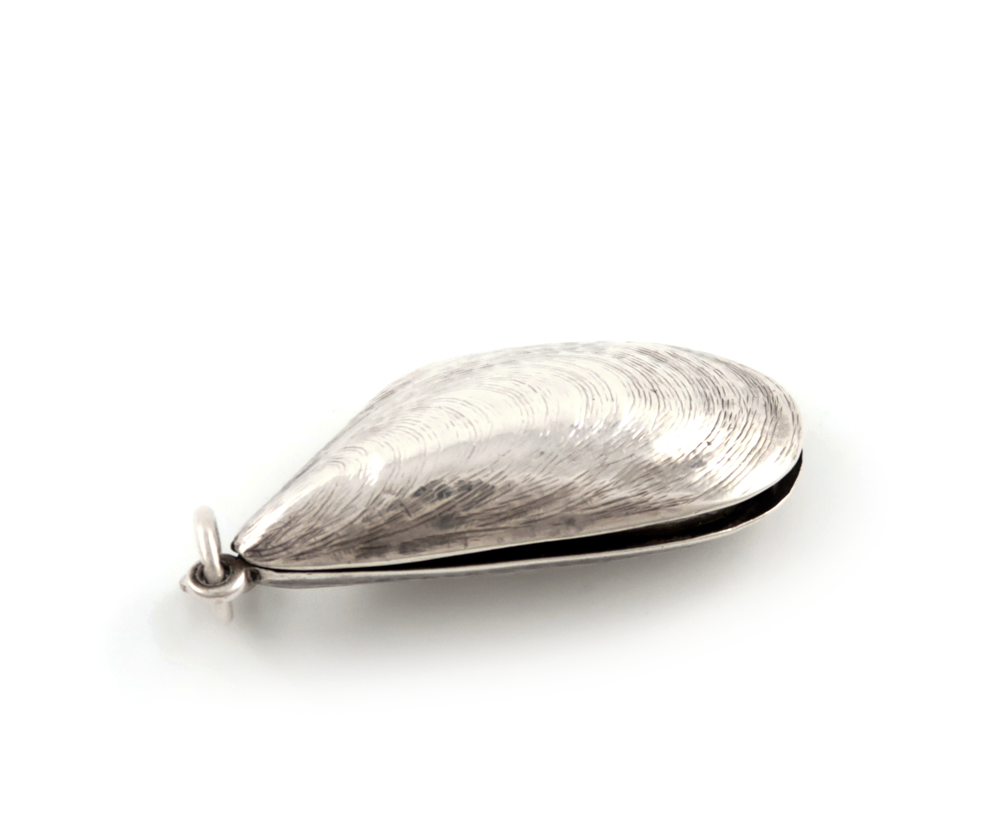 modelled as a mussel shell, textured decoration, the hinged cover opens to reveal a pierced and engraved foliate scroll grille, with a ring attachment, length 4.8cm, approx. weight 0.5oz.