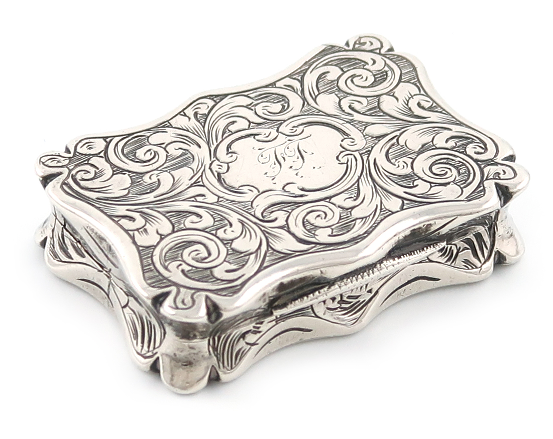 shaped rectangular form, engraved foliate scroll decoration, the hinged cover initialled, the interior with a hinged pierced and engraved grille, length 3.8cm, approx. weight 0.6oz.