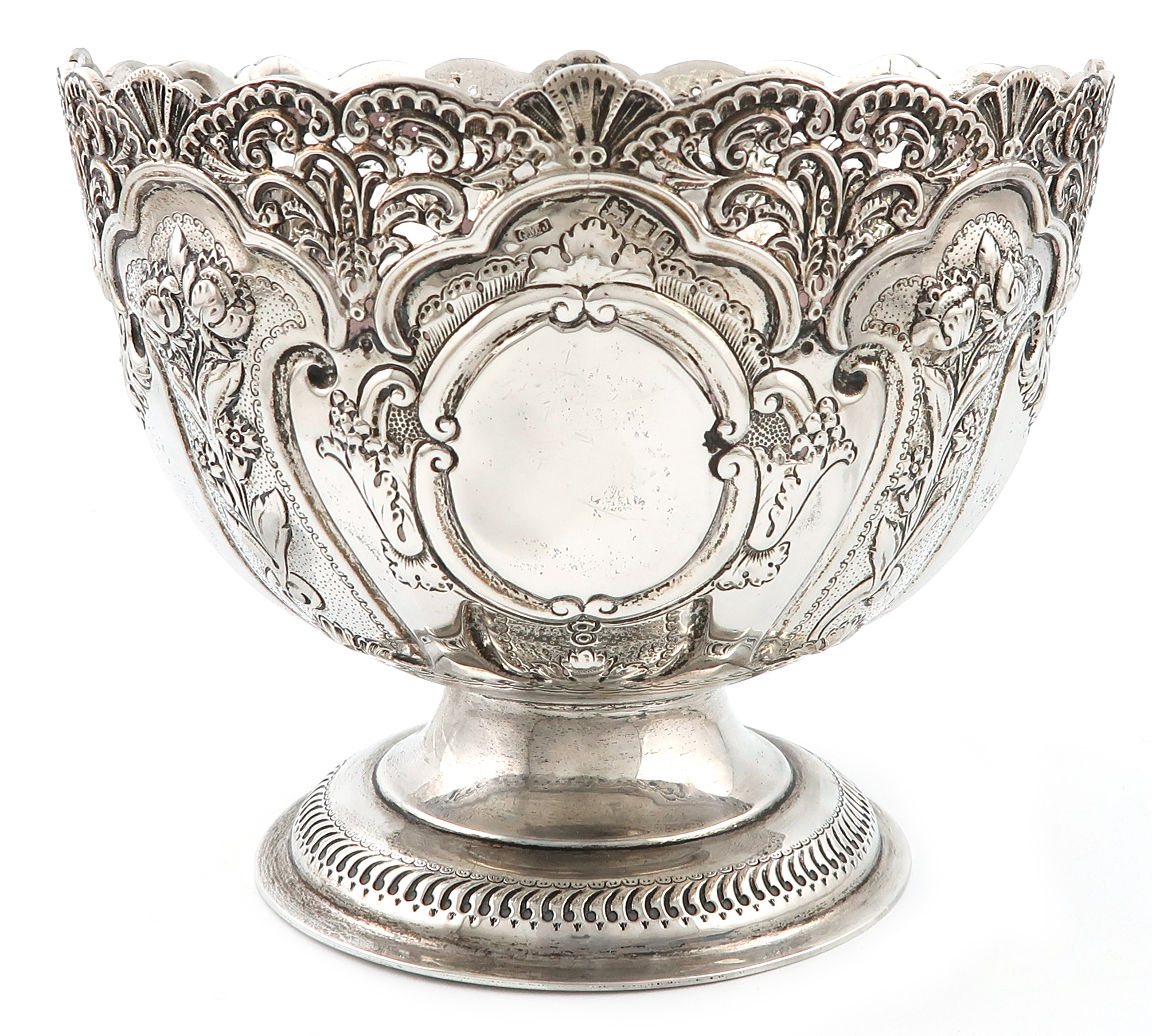 circular form, embossed and pierced foliate scroll decoration, with two vacant cartouches, on a raised circular foot, diameter 21cm, approx. weight 24.5oz.