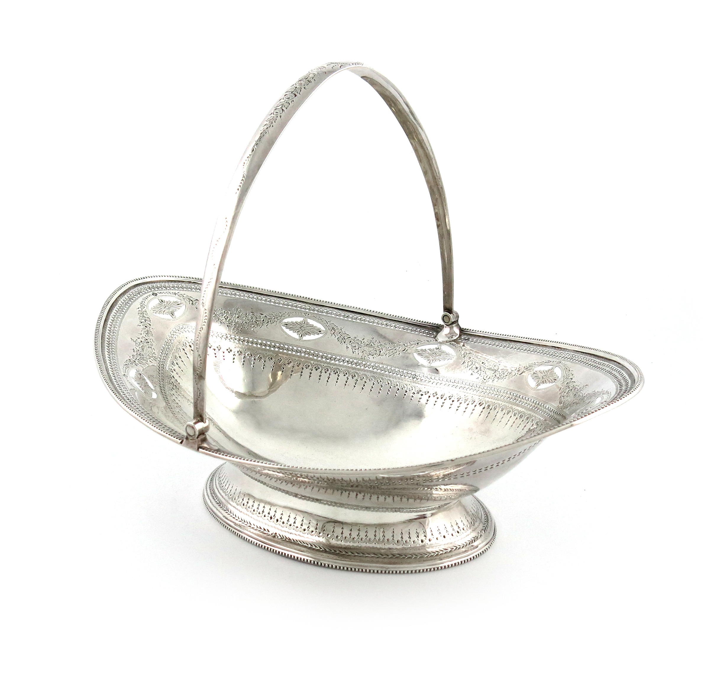 oval form, pierced and engraved foliate and garland decoration, beaded outer border and engraved swing-handle, on a raised oval foot, length 33.7cm, approx. weight 20.8oz.