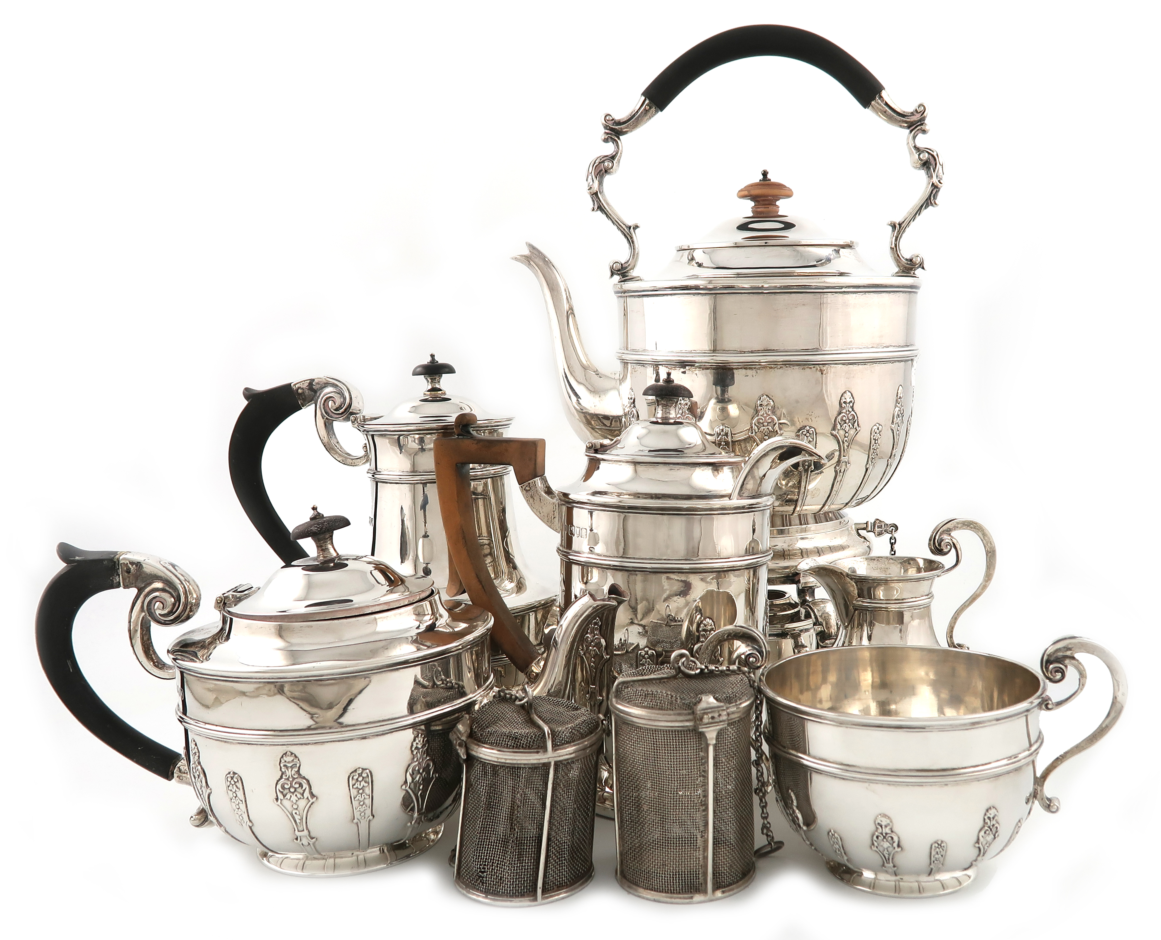 comprising a kettle-on-stand, a coffee pot, a teapot, a hot water jug, a cream jug and sugar bowl, circular bellied form, applied cut-card decoration, scroll handles, the hinged covers with knop finial, the kettle with a central carrying handle, the stand on three scroll legs terminating on pad feet, the teapot handle a.f, with two electroplated basket peculators, height of kettle 39cm, approx. weight 164oz. (6)