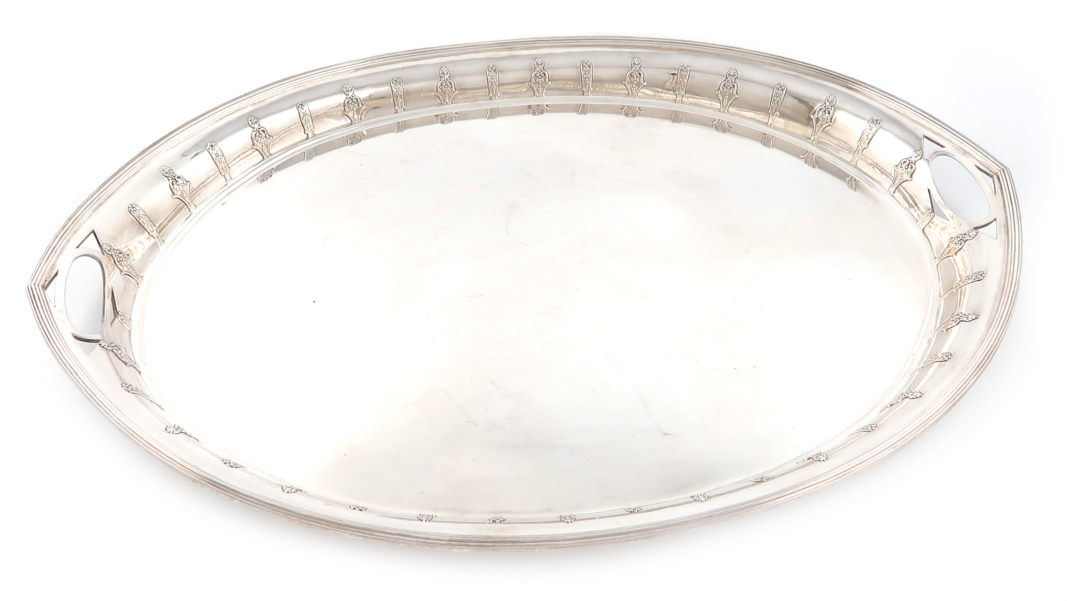 oval form, inset handles, applied cut-card decoration, reeded border, length handle to handle 62.3cm, approx. weight 118oz.
