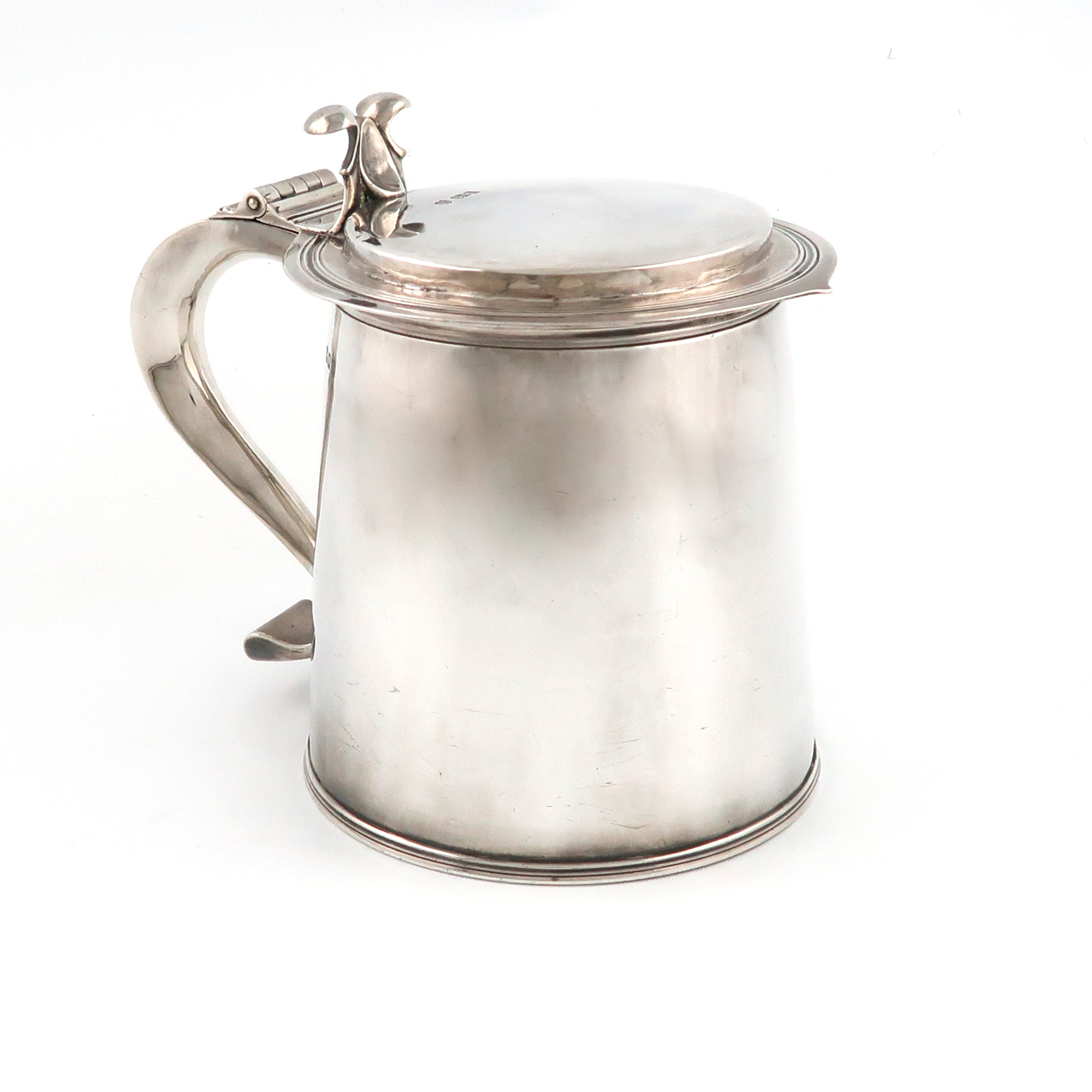 in the Charles II manner, tapering circular form, flat-hinged cover with a scroll thumb-piece, scroll handle, height 17cm, approx. weight 31oz.