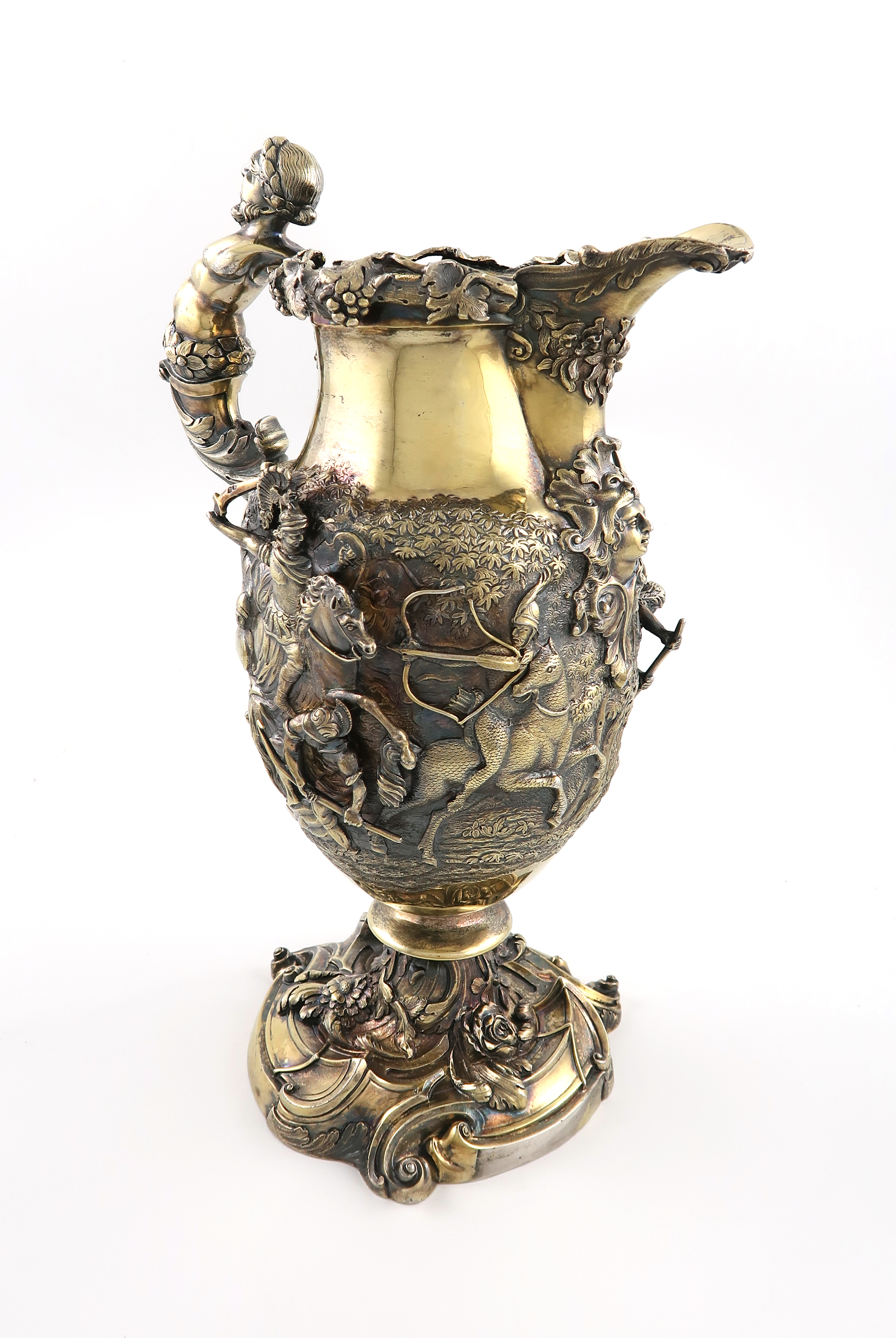 baluster form, on a raised Rococo scroll foot, the body chased with battle scenes, and with a male caryatid scroll handle, the spout with a garland of flowers and a mask motif, the top of the ewer with a trailing vine border, height 34.5cm, approx. weight 83.2oz.
