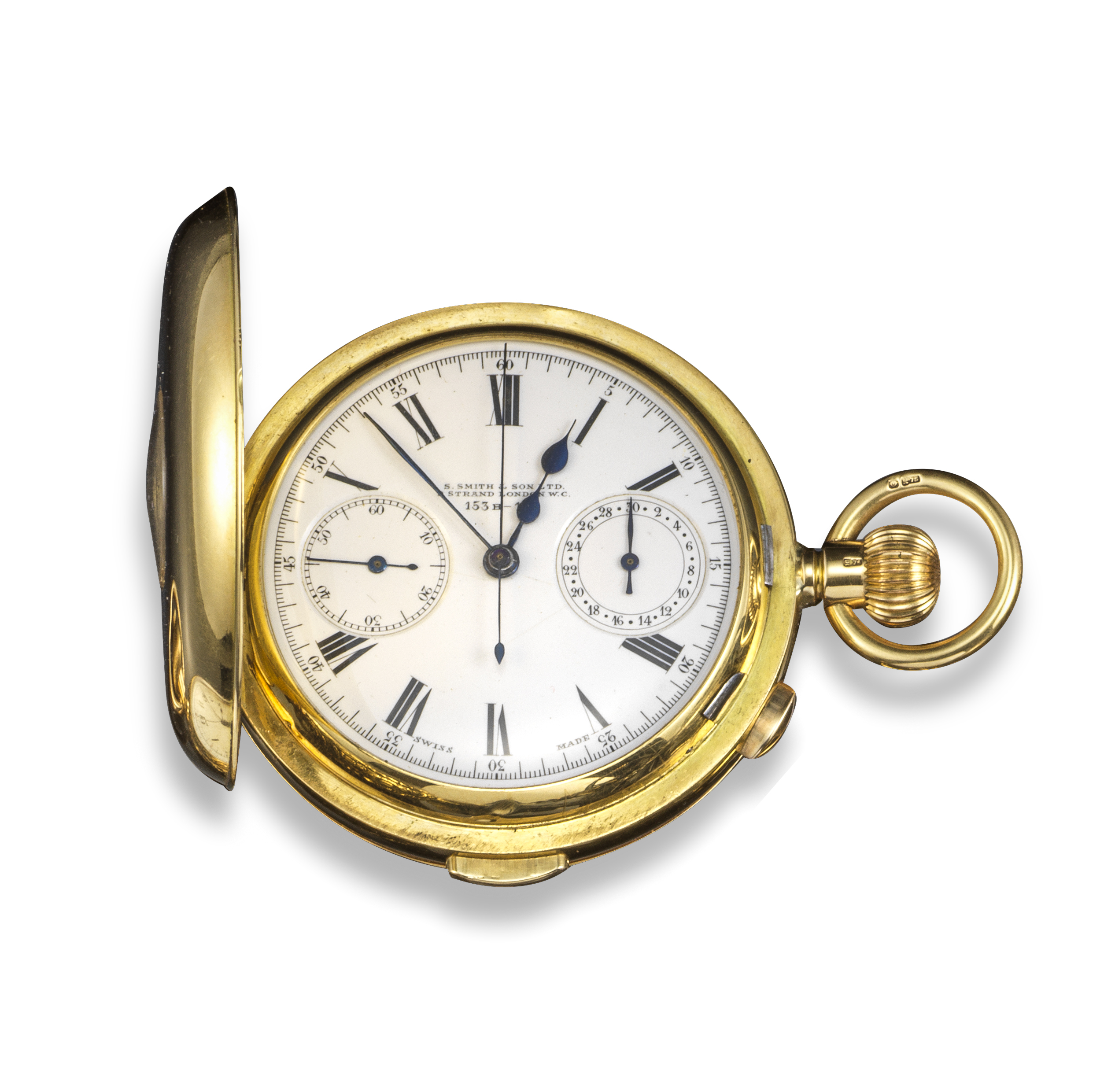 An 18ct gold hunting-cased minute repeating chronograph, the dial signed for S. Smith & Son, 9 Strand London, 153B-135, subsidiary seconds dial at 3 and 30 minutes dial at 9, stem-wind, the back case heavily engraved with initials, push-button activation, 5cm wide