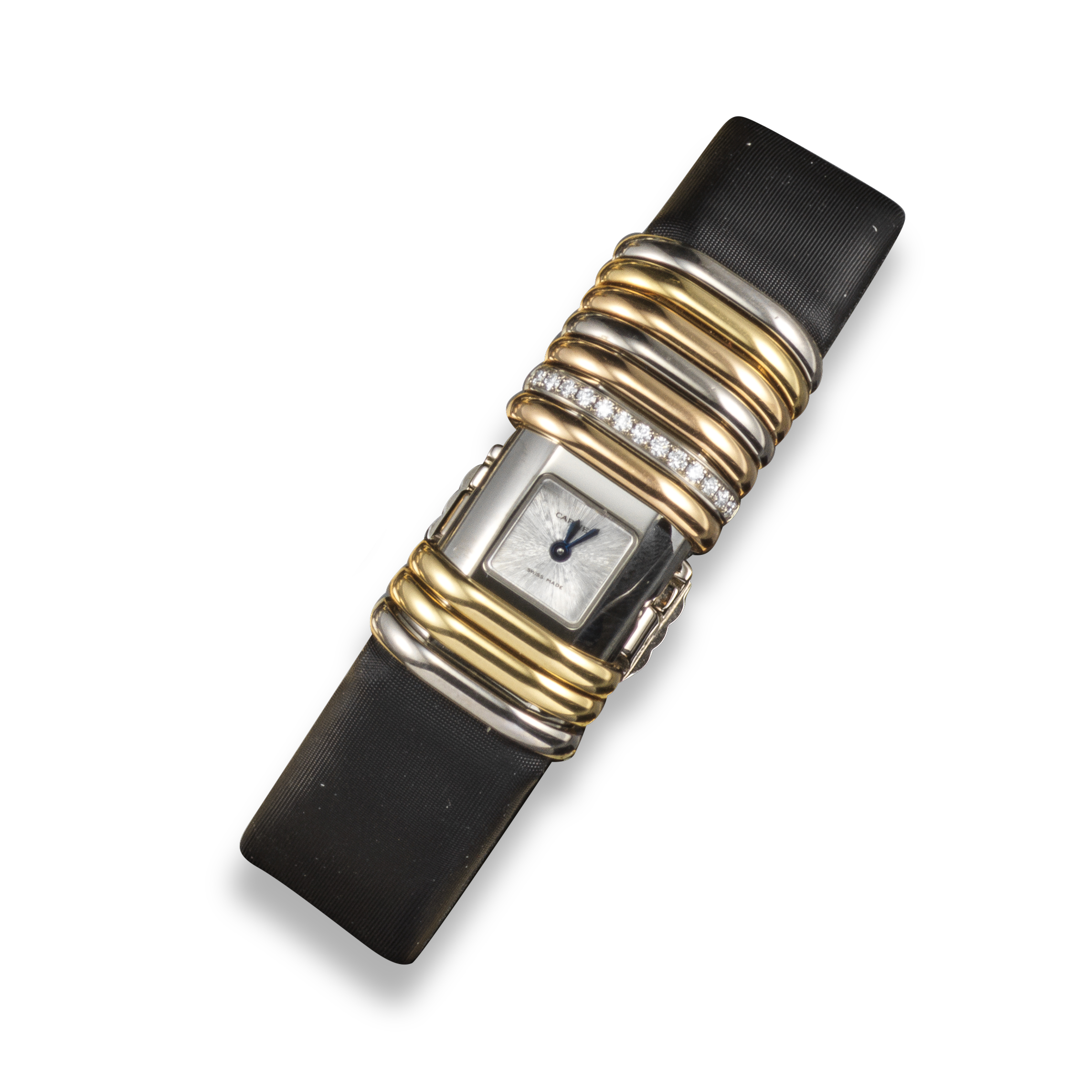 A titanium and 18ct gold Declaration wristwatch by Cartier, silver sunburst effect dial with curved rectangular case, set with a quatrefoil of circular-cut diamonds and numbered 80113CE2611, with eight three-colour gold sliding rings, one set with small diamonds, black silk band with white gold deployant clasp, Cartier box and key, 15.5cm long
