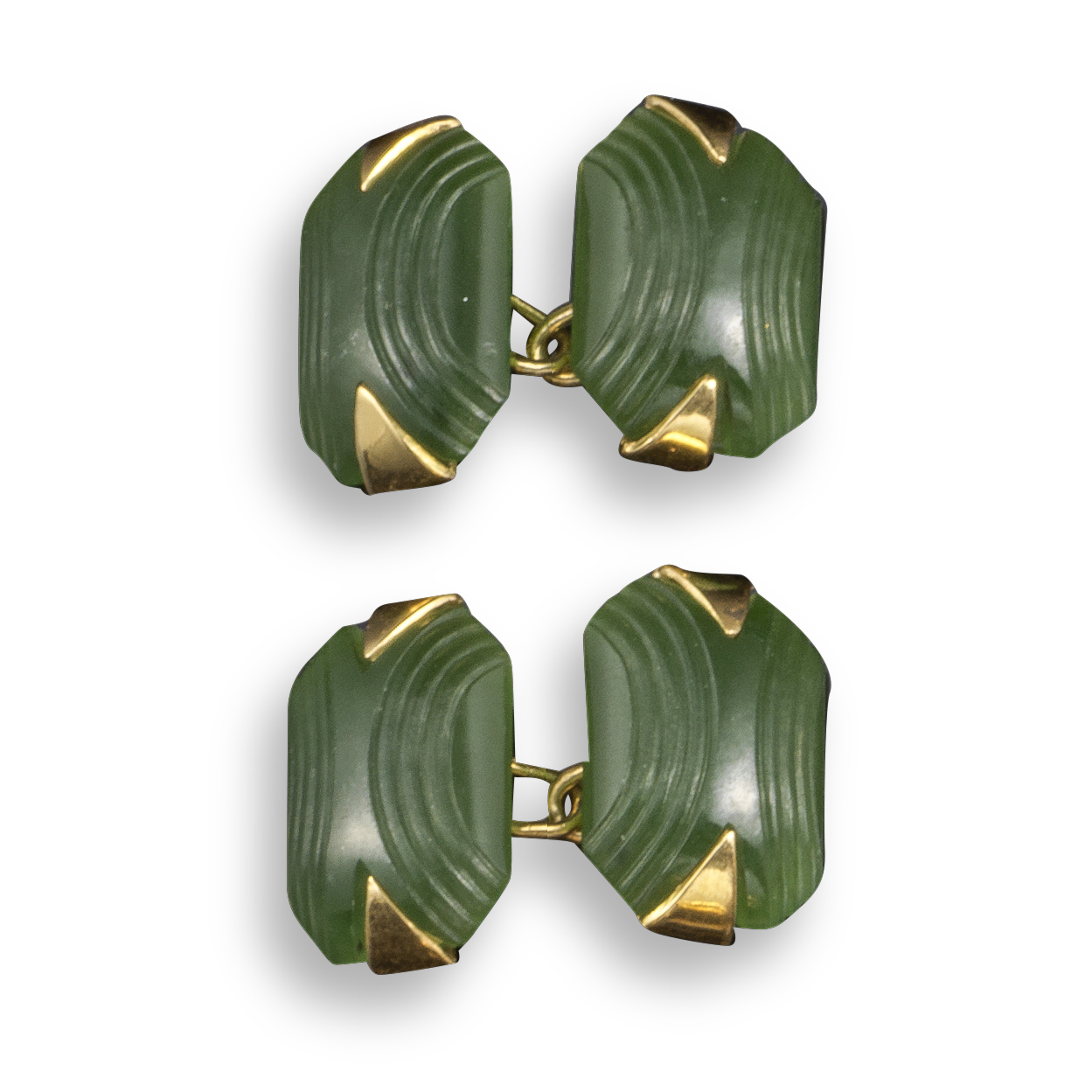 A pair of nephrite and gold cufflinks by René Boivin, the carved nephrite links with waisted fluted decoration, set in yellow gold. 17mm long