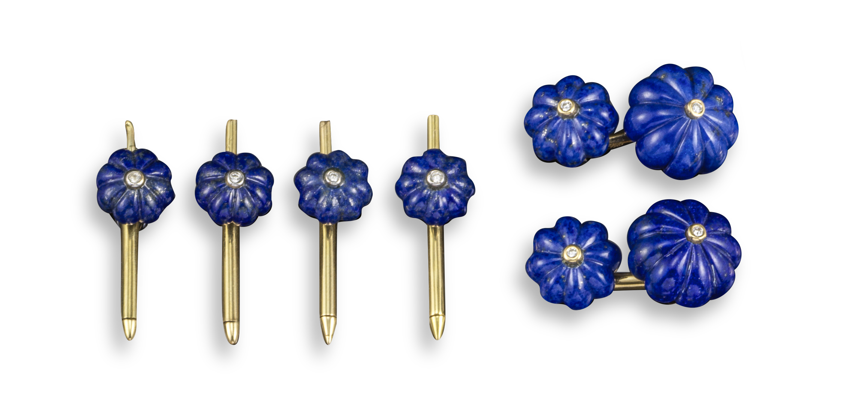 A lapis lazuli and diamond dress set, comprising cufflinks and four buttons, the fluted lapis lazuli beads each set with a diamond in yellow gold