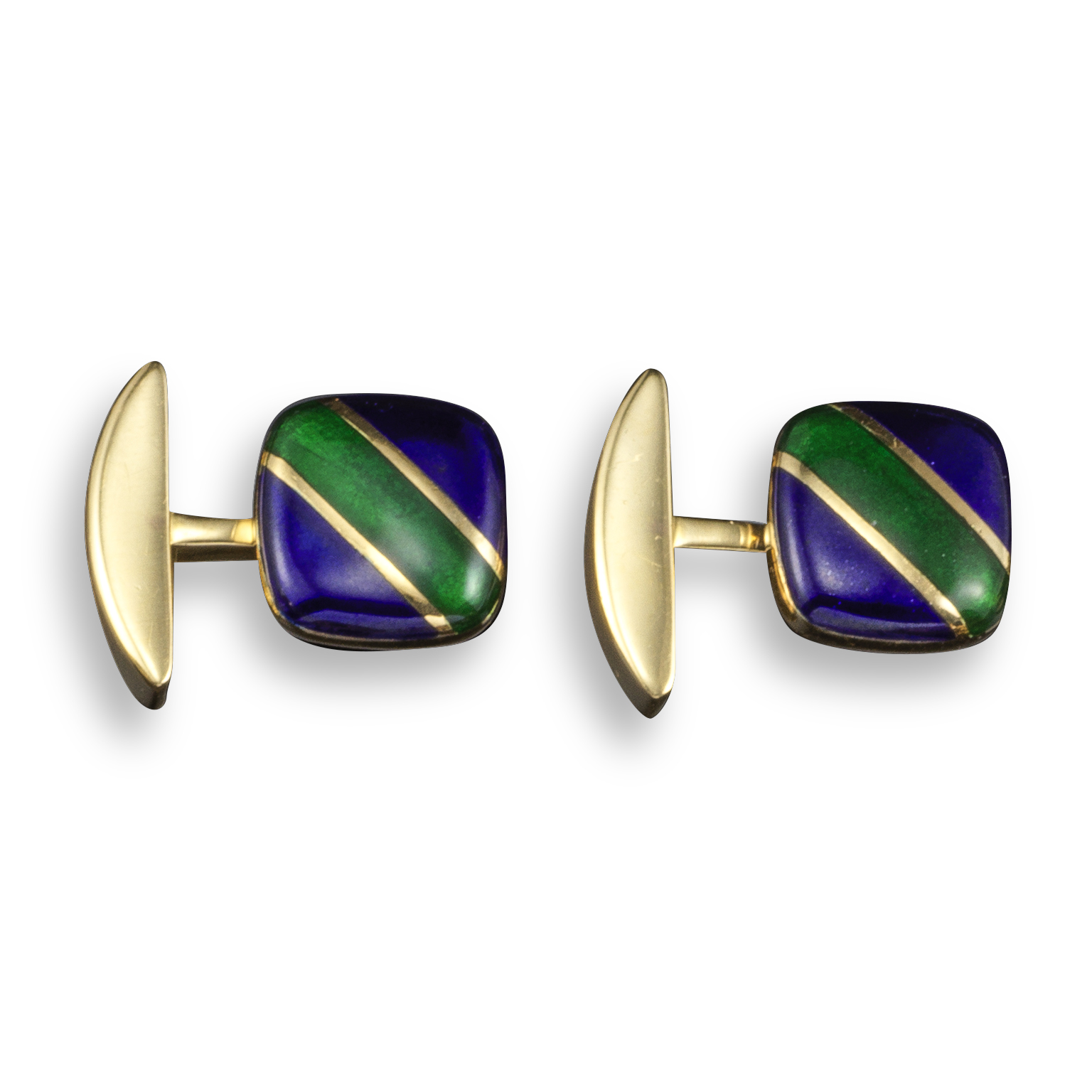 A pair of enamel and gold cufflinks, with blue and green striped enamel decoration in yellow gold, with Italian hallmarks and stamped 750, each 1.3cm wide