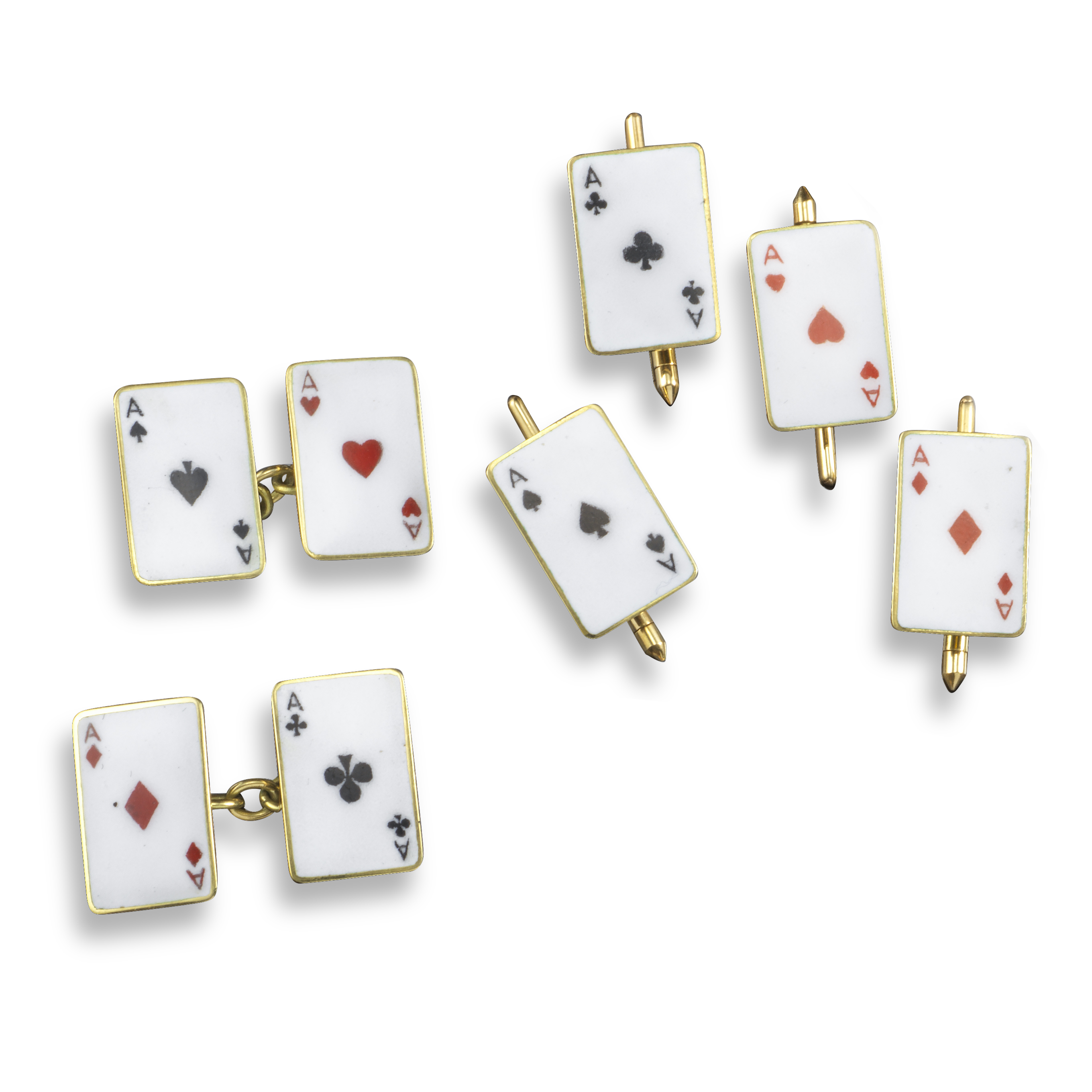 A set of playing card cufflinks, depicting the four aces in enamel, with four matching buttons in yellow gold
