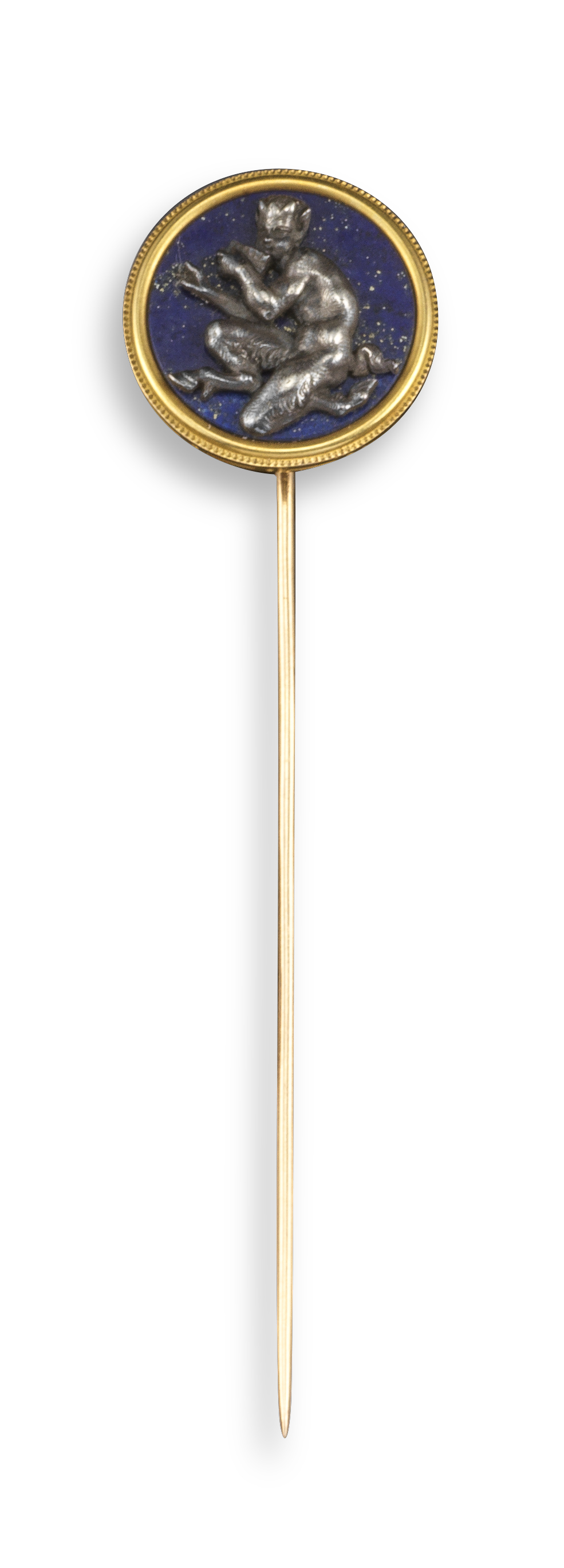 A 19th century French gold stickpin by Fannière Frères, depicting Pan in silver on lapis lazuli, within engraved gold border, signed to reverse and with French marks to pin, 8.3cm high, 2.1cm wide