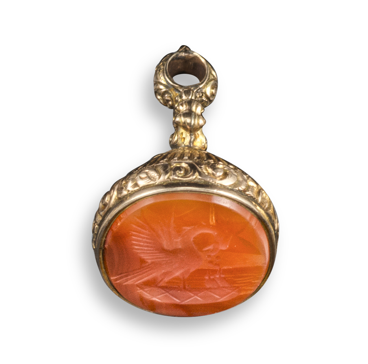 An early 19th century gold seal, set with a carnelian intaglio depicting a pelican in her piety, 3.5cm high