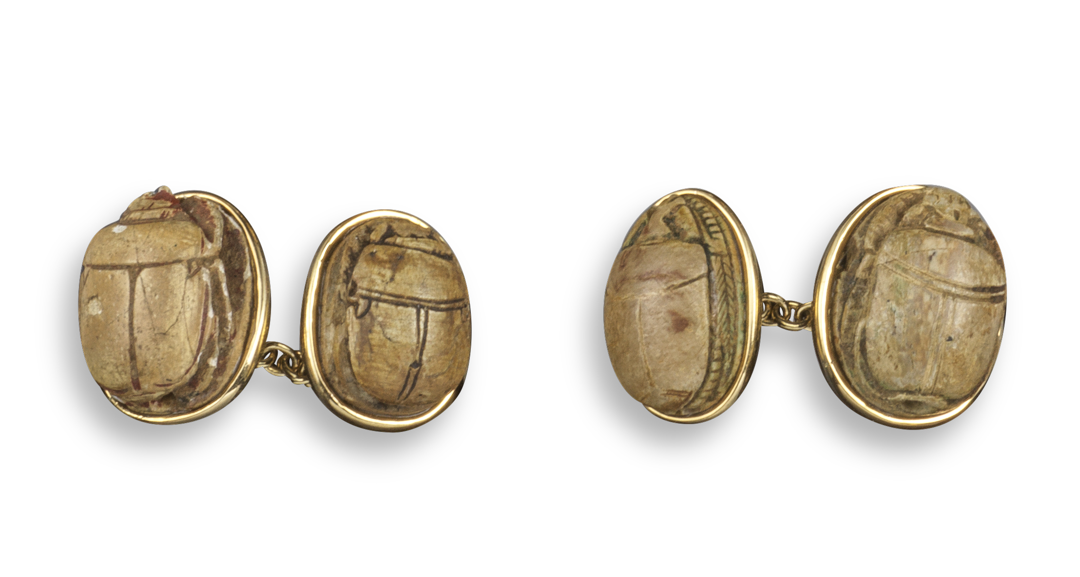 A pair of scarab cufflinks, within yellow gold settings, joined on oval-link chains