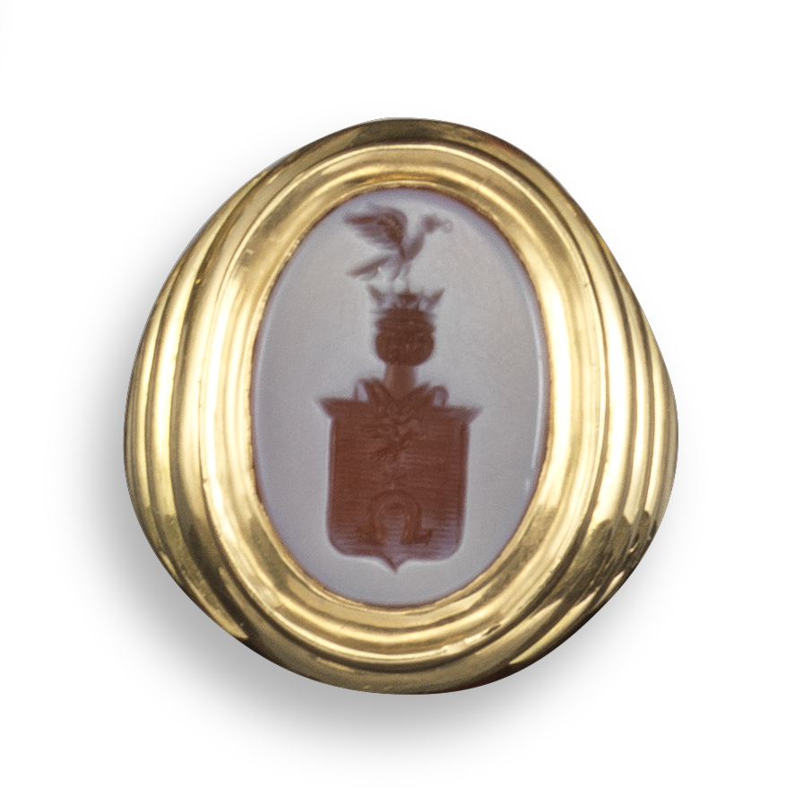 A fluted yellow gold ring set with a banded agate intaglio, engraved with the coat of arms for Slepowren, size O