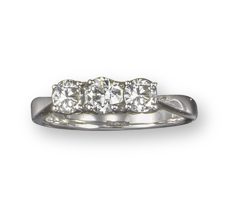 A diamond three-stone ring, set with an old circular-cut diamond and two round brilliant-cut diamonds in platinum, size M