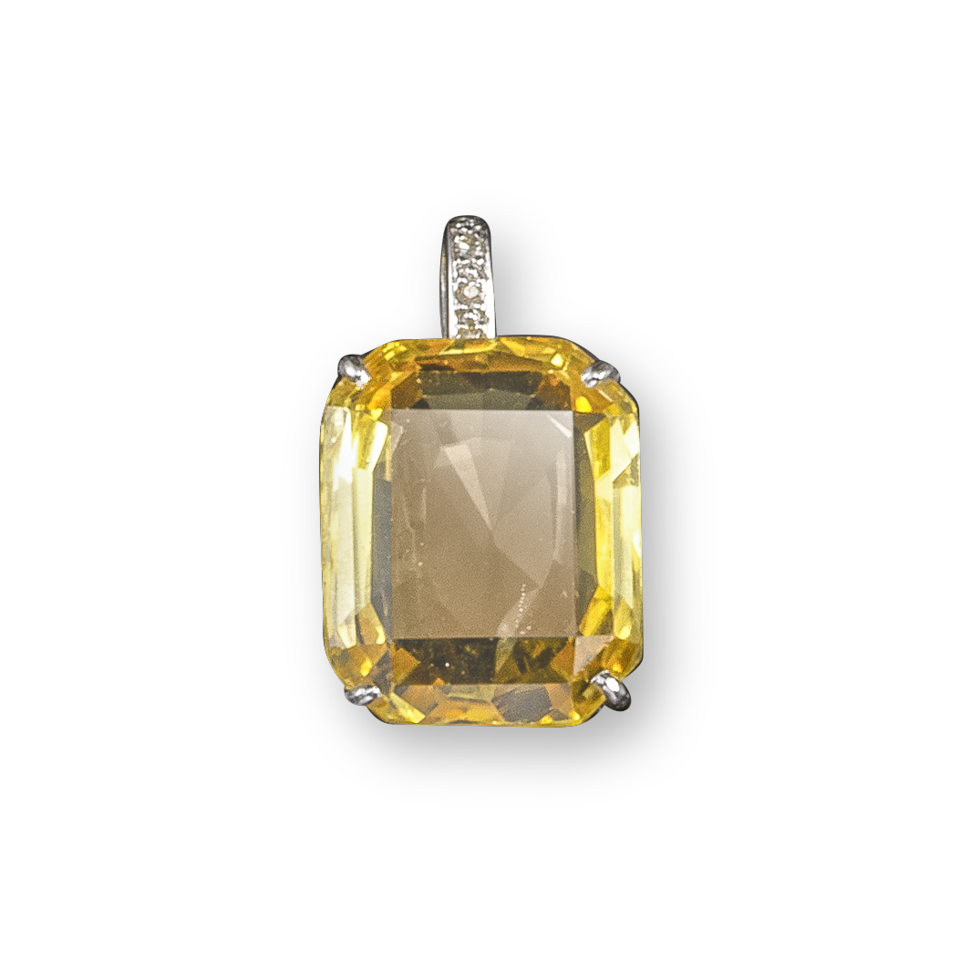 A yellow sapphire and diamond pendant, the rectangular-cut sapphire is claw-set and suspends from a diamond-set bale in white gold, 2.2cm high